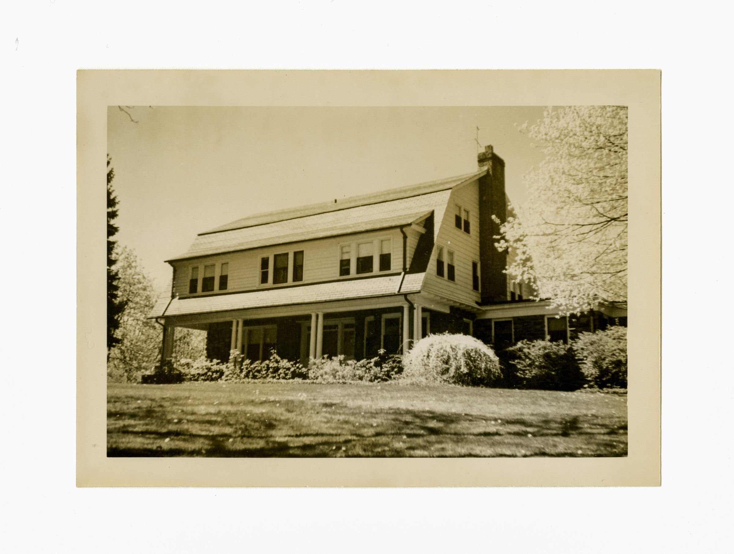 A three story house with a long dormer on the second floor and a gambrel-style roof.Collection