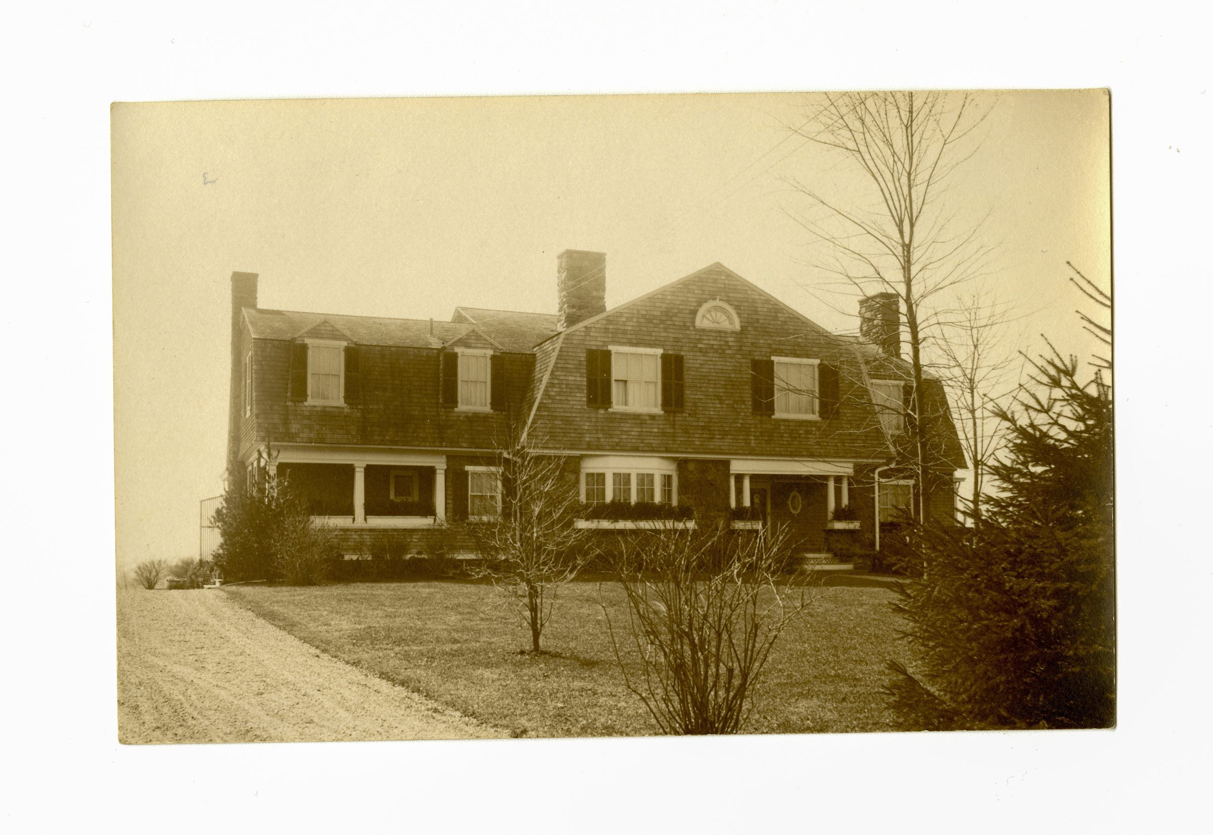 A three story shingle house with a gambrel-style roof and part of its lawn.