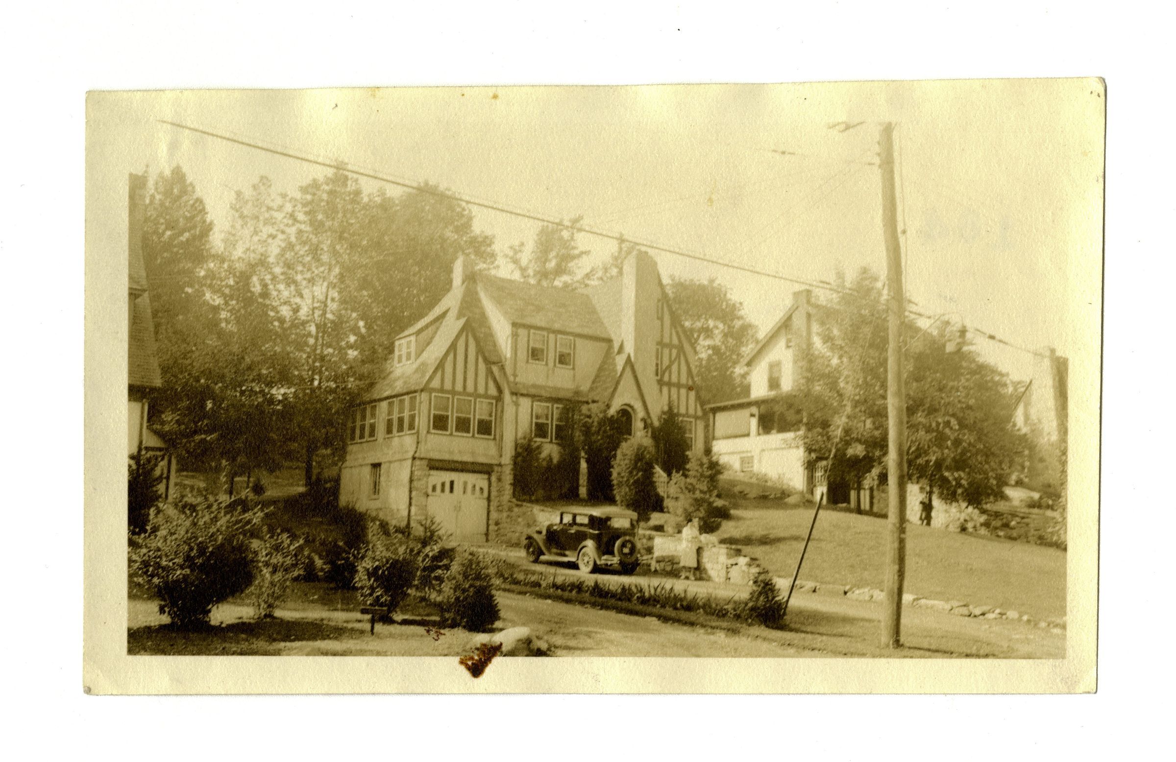 A three story English-style house with a sunken garage and a car parked in its driveway.Collection
