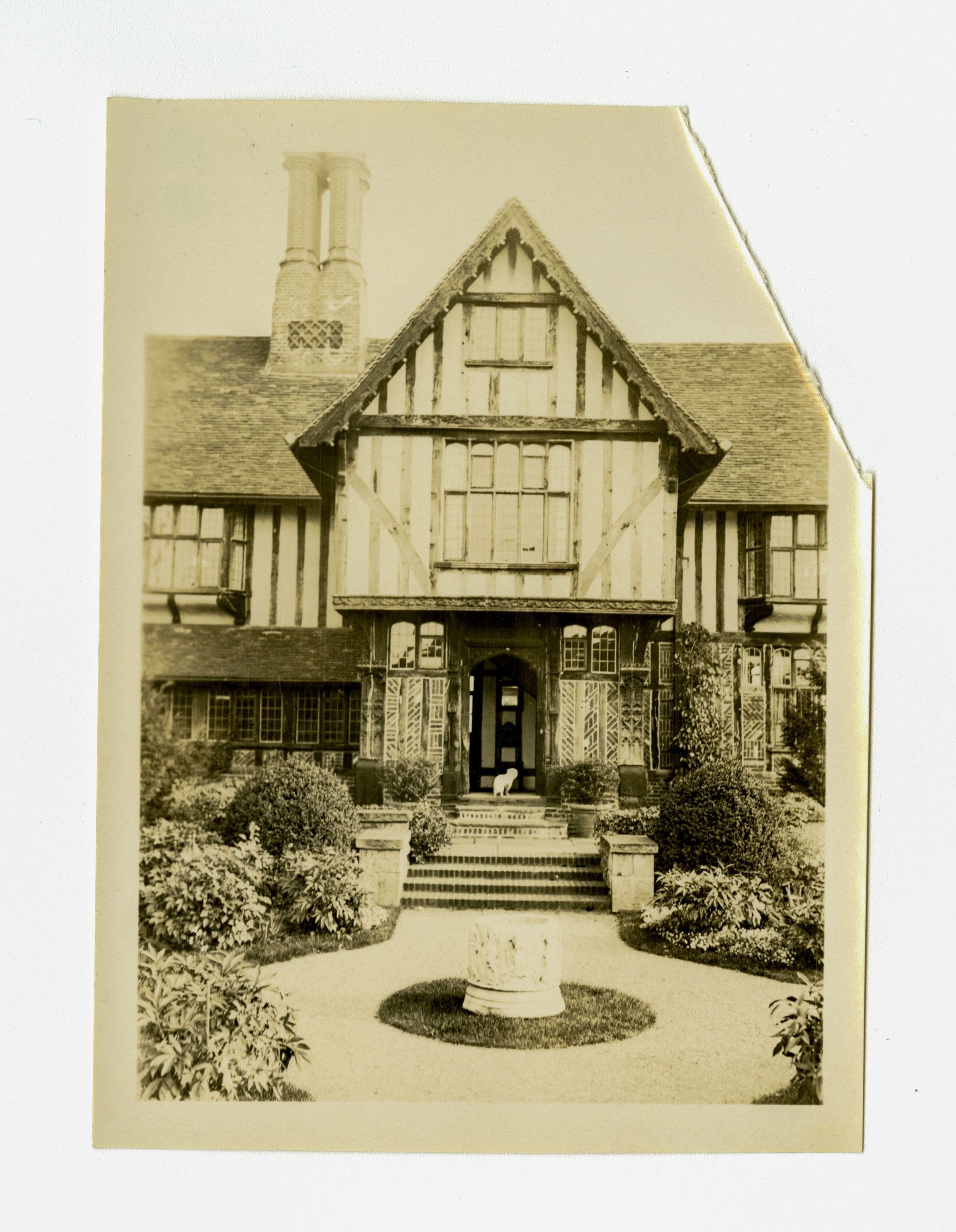 A view from the garden of an entrance into a three story Tudor-style house.Collection