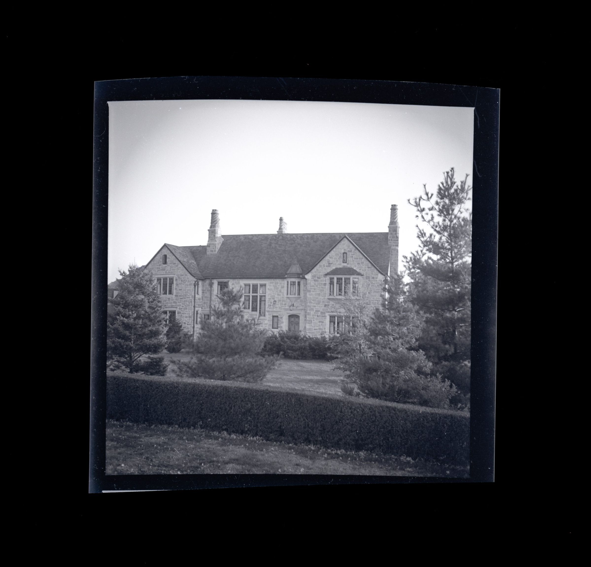 Stone mansion with multiple decorated stone chimneys, a second story bay window and a round oriel window above the front entrance.Collection