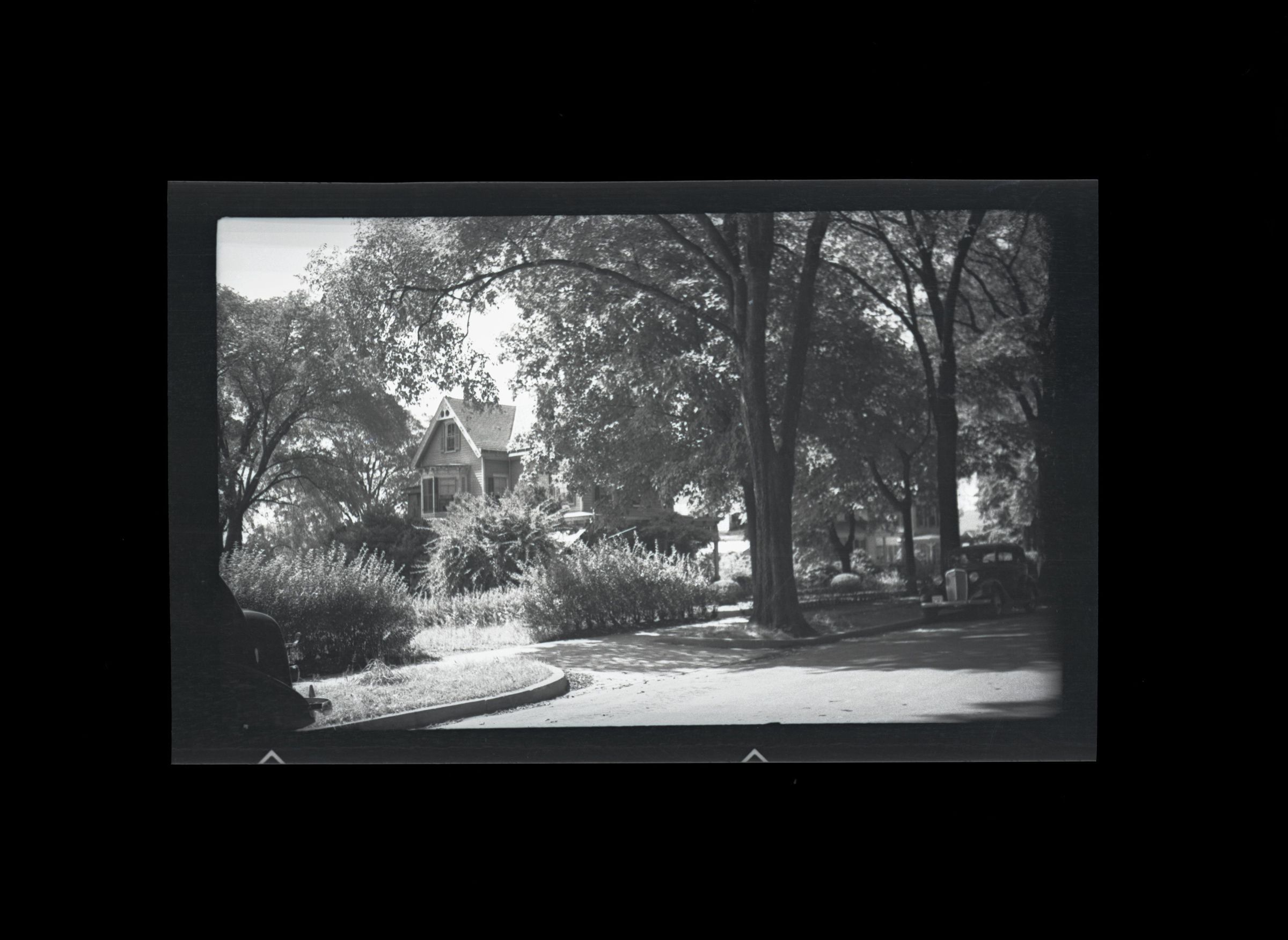 A home with gingerbread trim and a bay window with gardens in bloom viewed from the street. A car is parked on the street on the right of the image.Collection