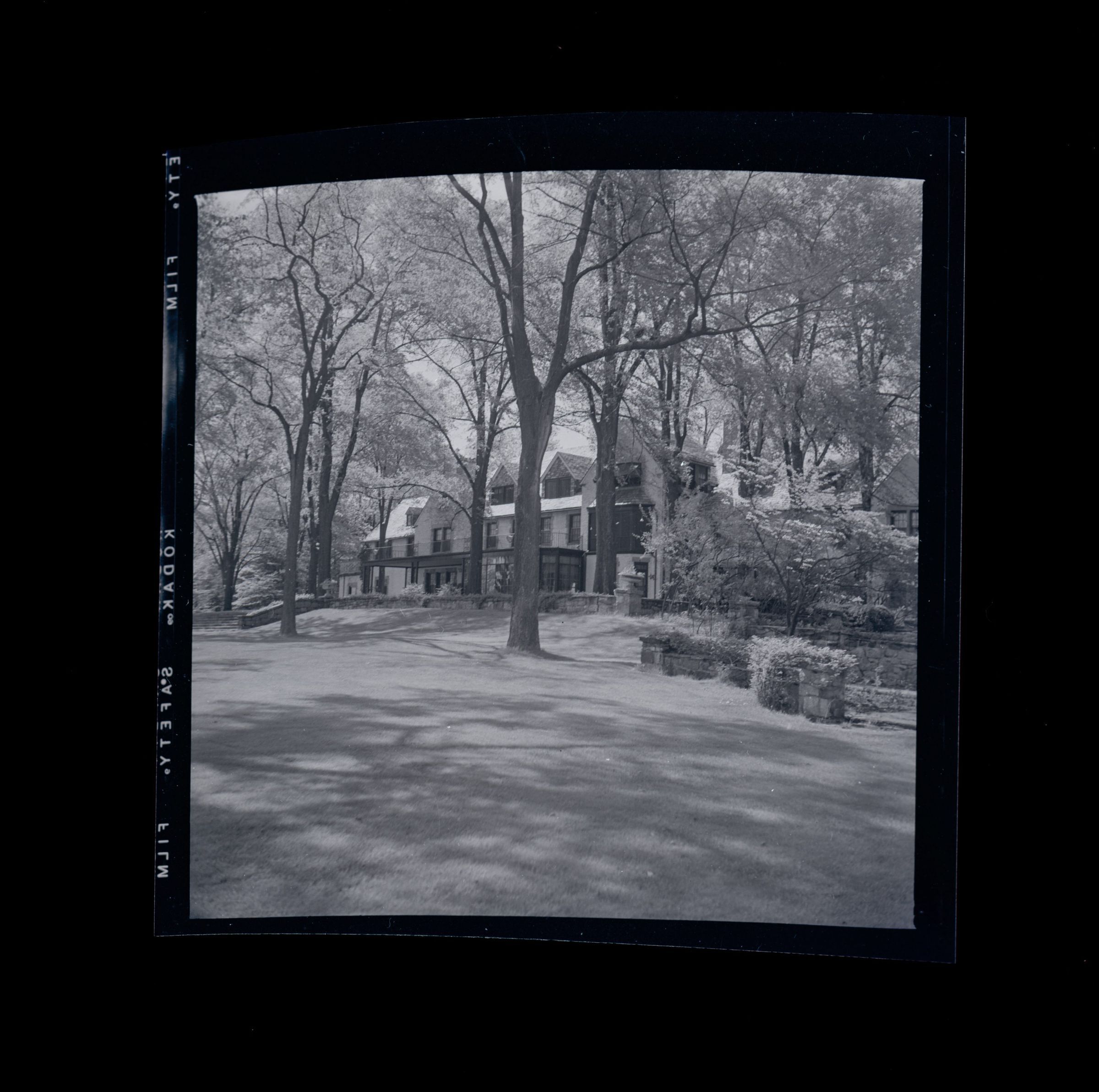 A view of the rear of a three story house from its lawn and many flowering trees.