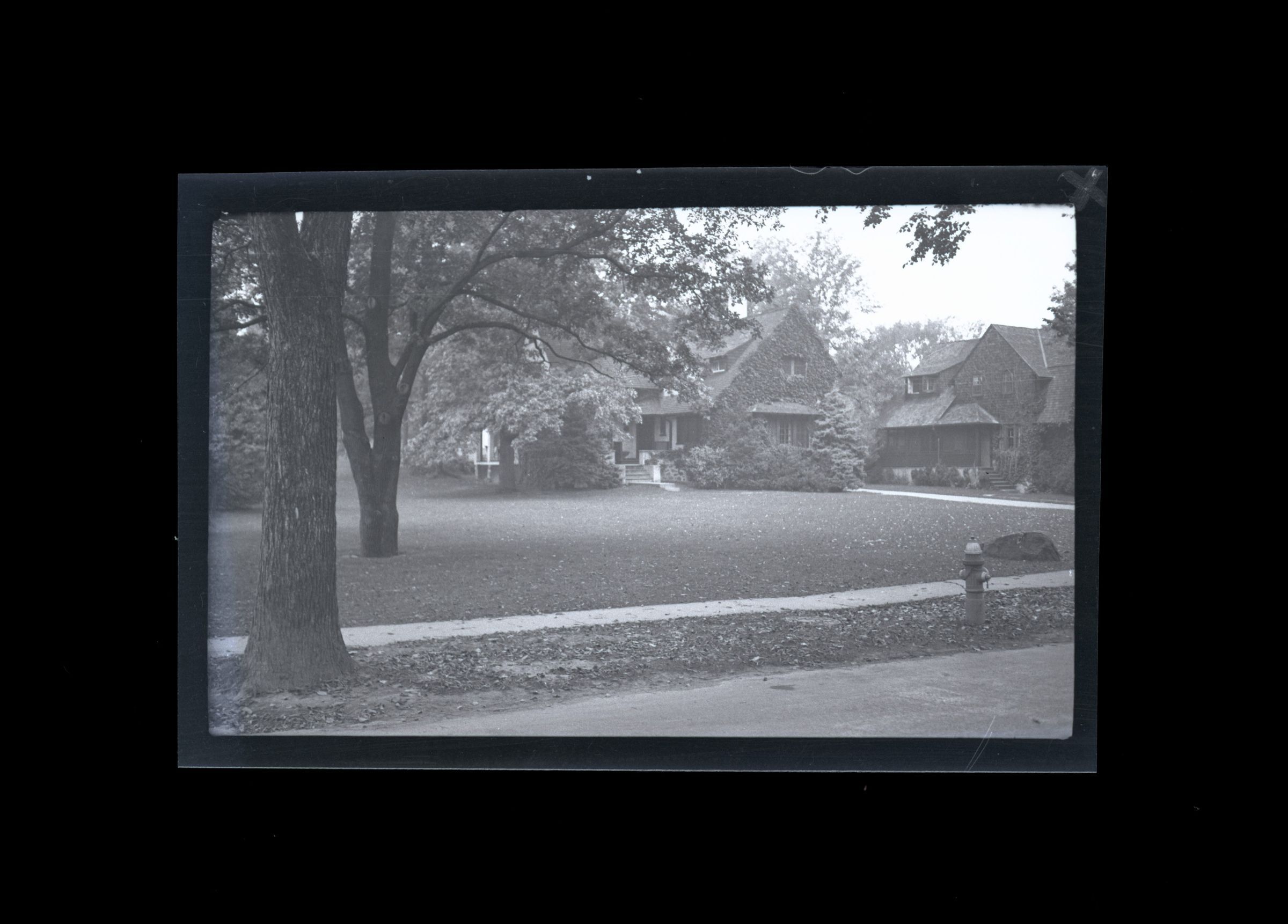 An ivy covered house and its front lawn as viewed from the street.