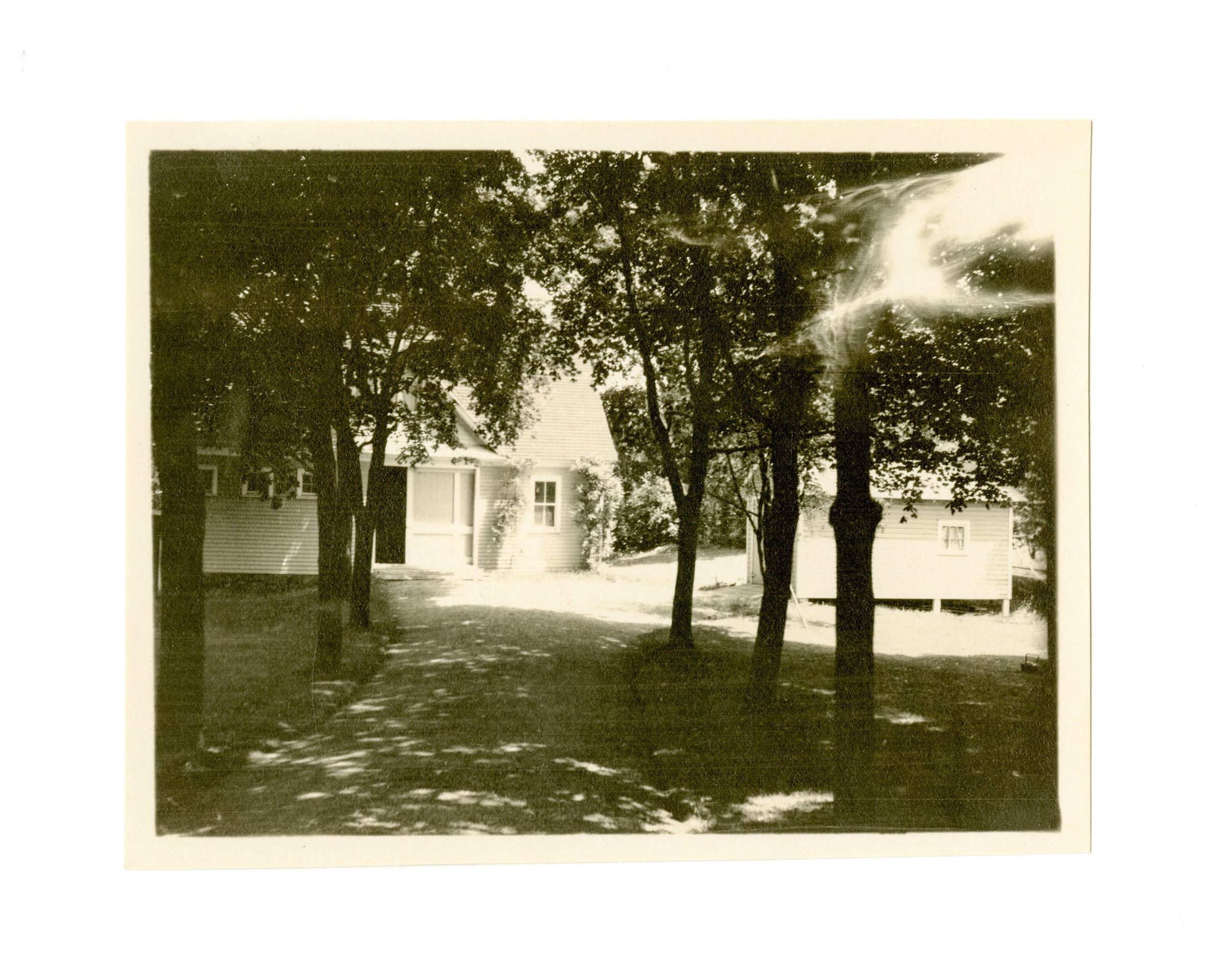 Two outbuildings on the property as seen from the tree-lined driveway.Collection