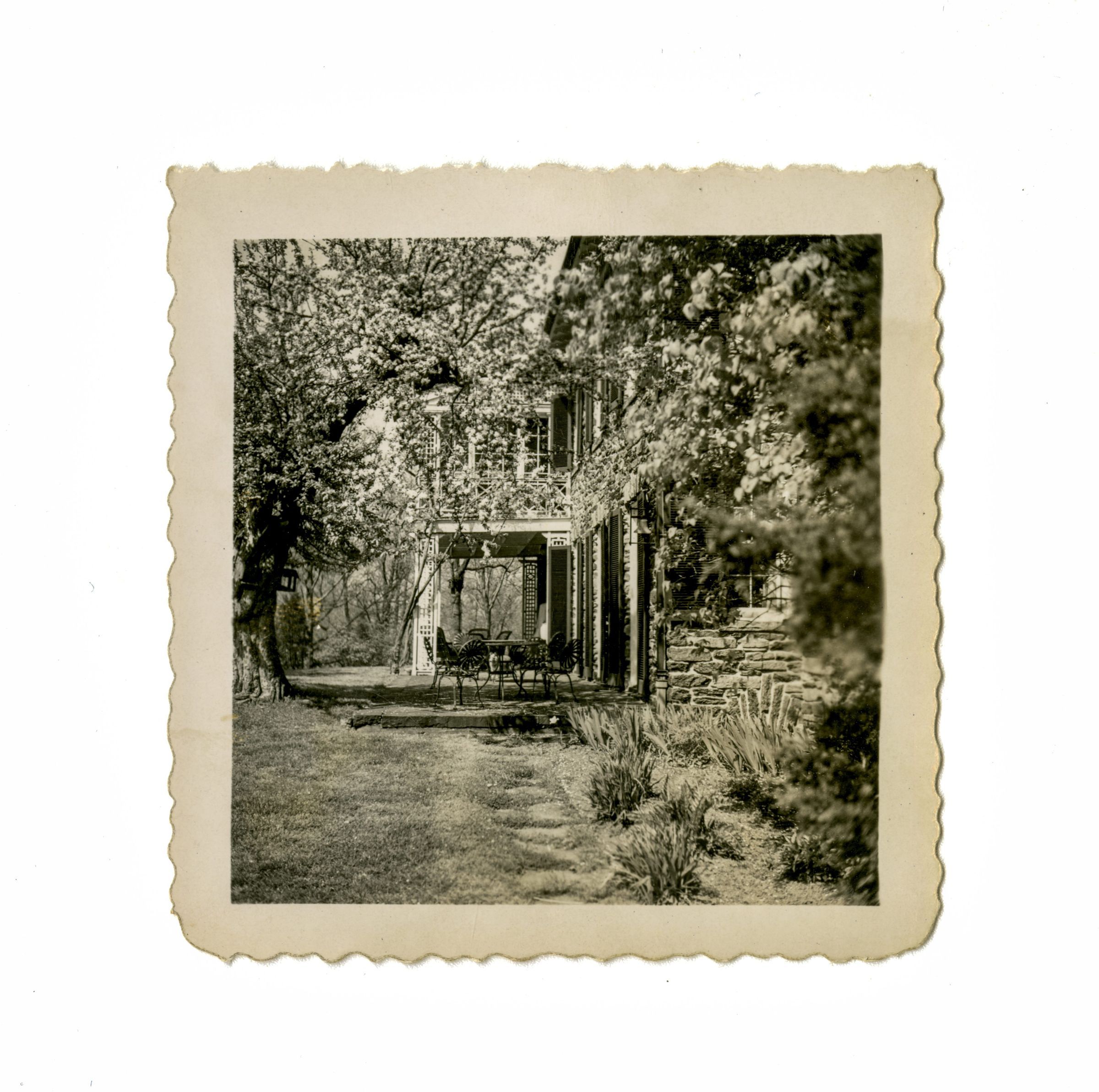 A view of the side of a three story, stone house and its patio with flowering trees.Collection