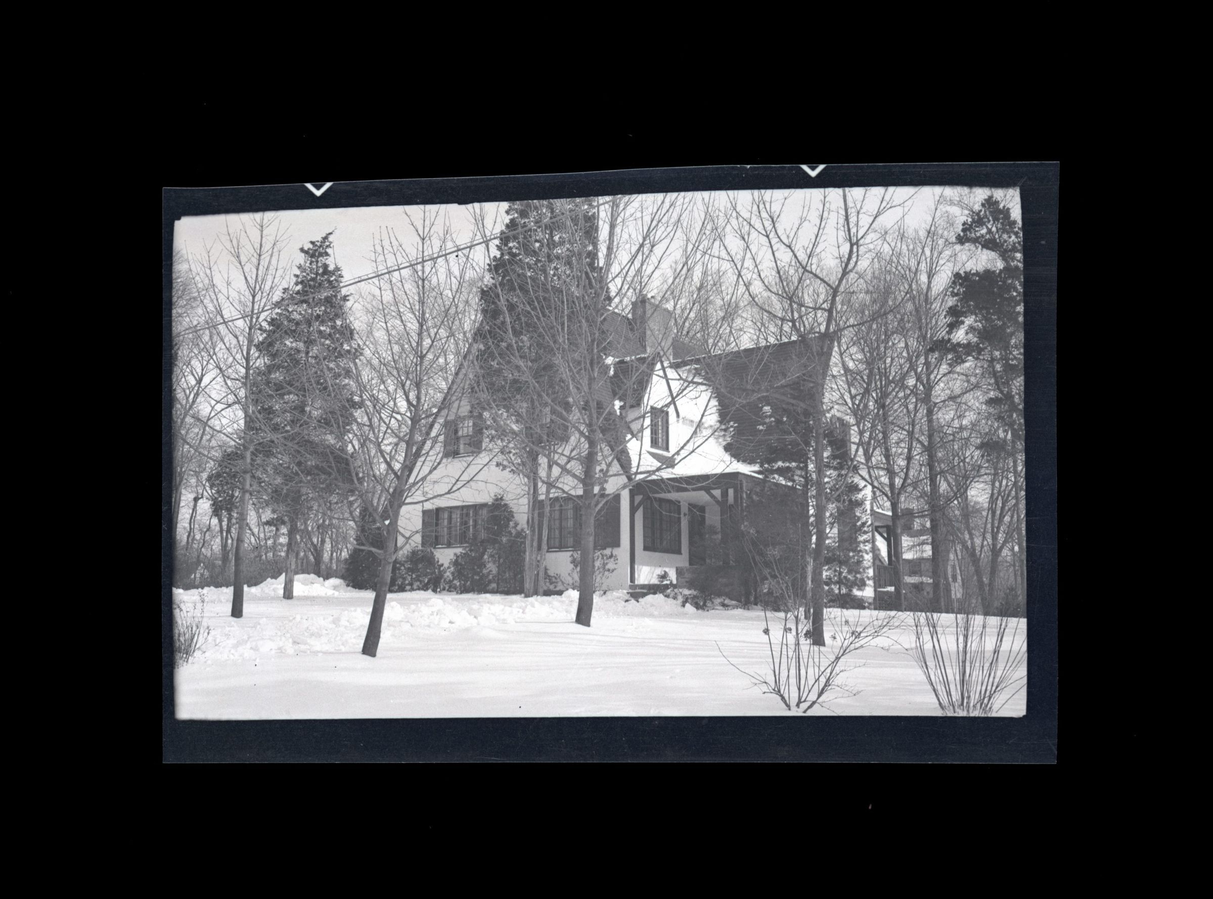 A two story house in the snow.