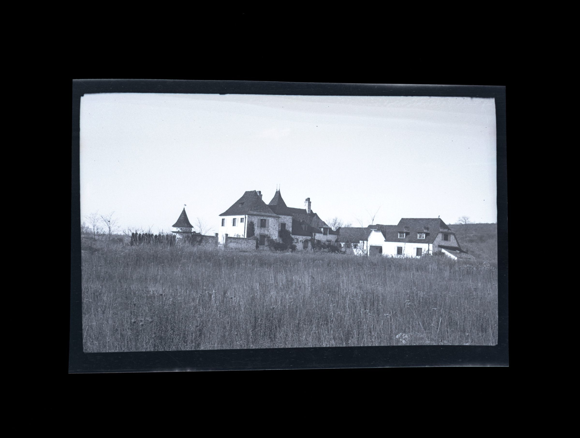 French Provencal style home with steeply pitched roofs on the main structure and a round tower with conical roof abutting the attached stone wall.Collection