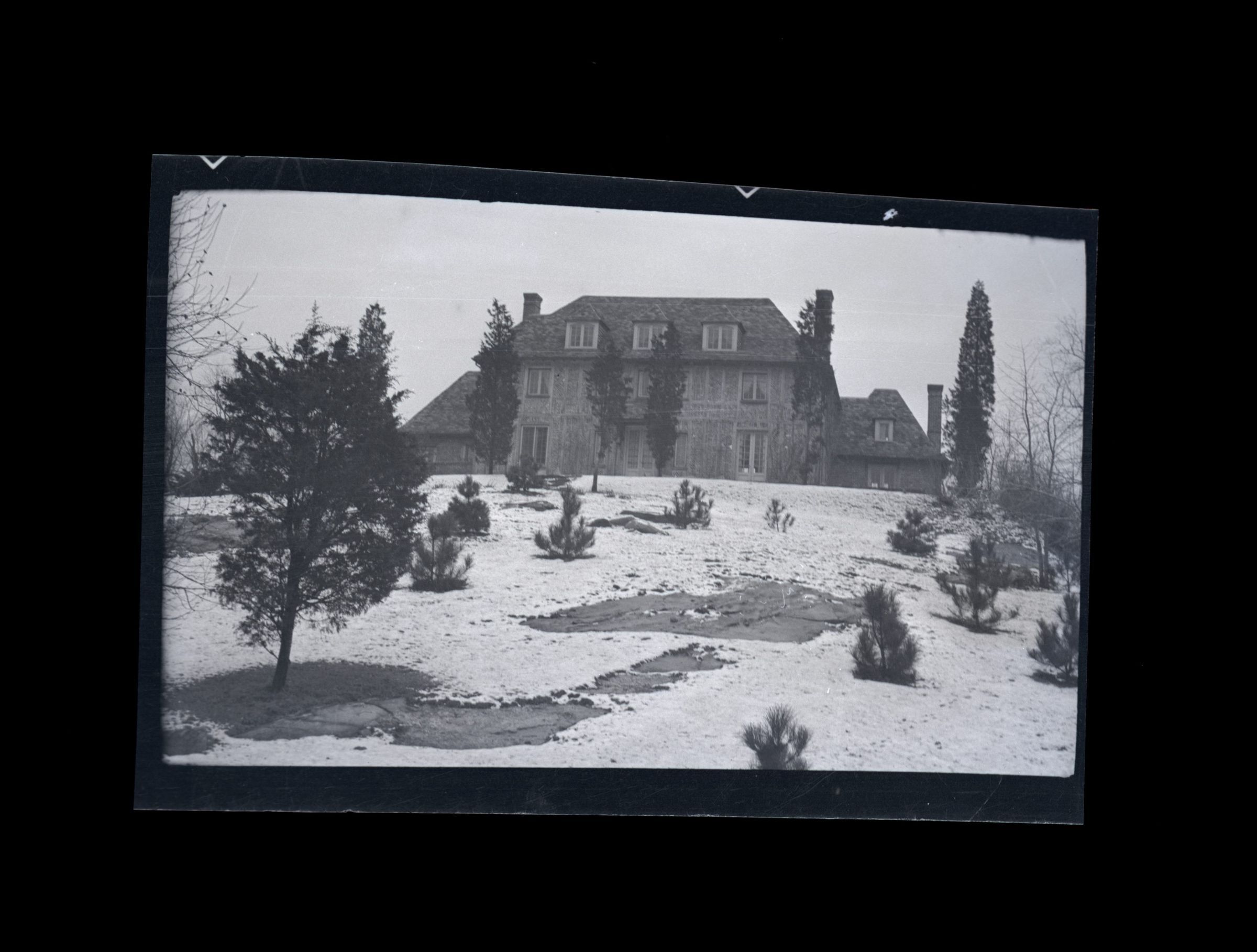 A three story house with three dormers on its top floor as seen looking up from its snow covered lawn.Collection
