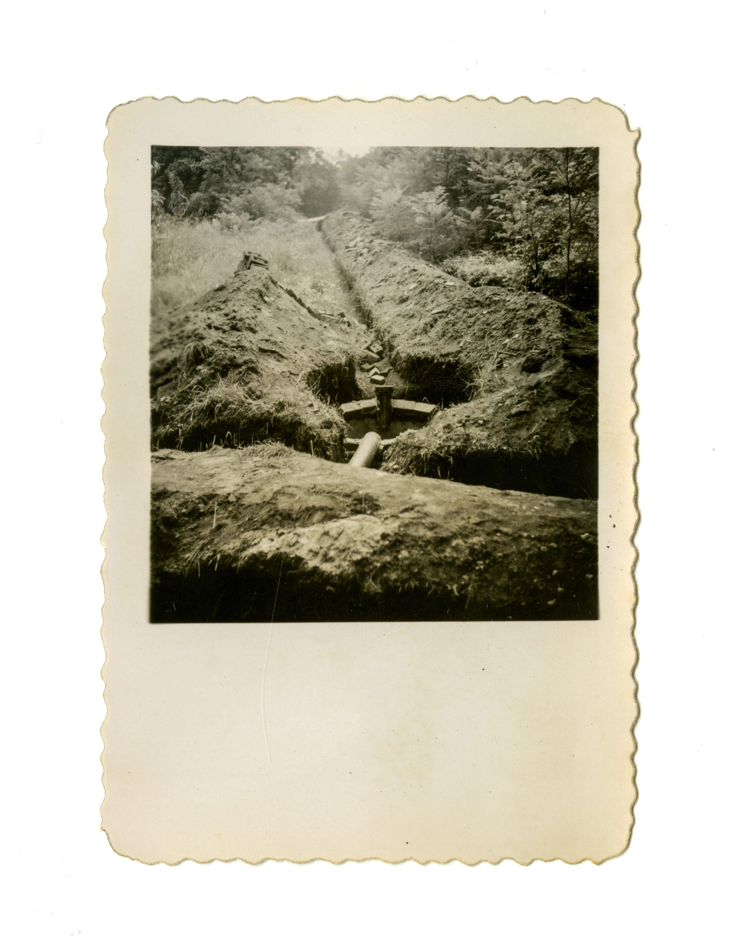 An image of a furrow in a field leading to a hole with a pipe leading up to it.Collection