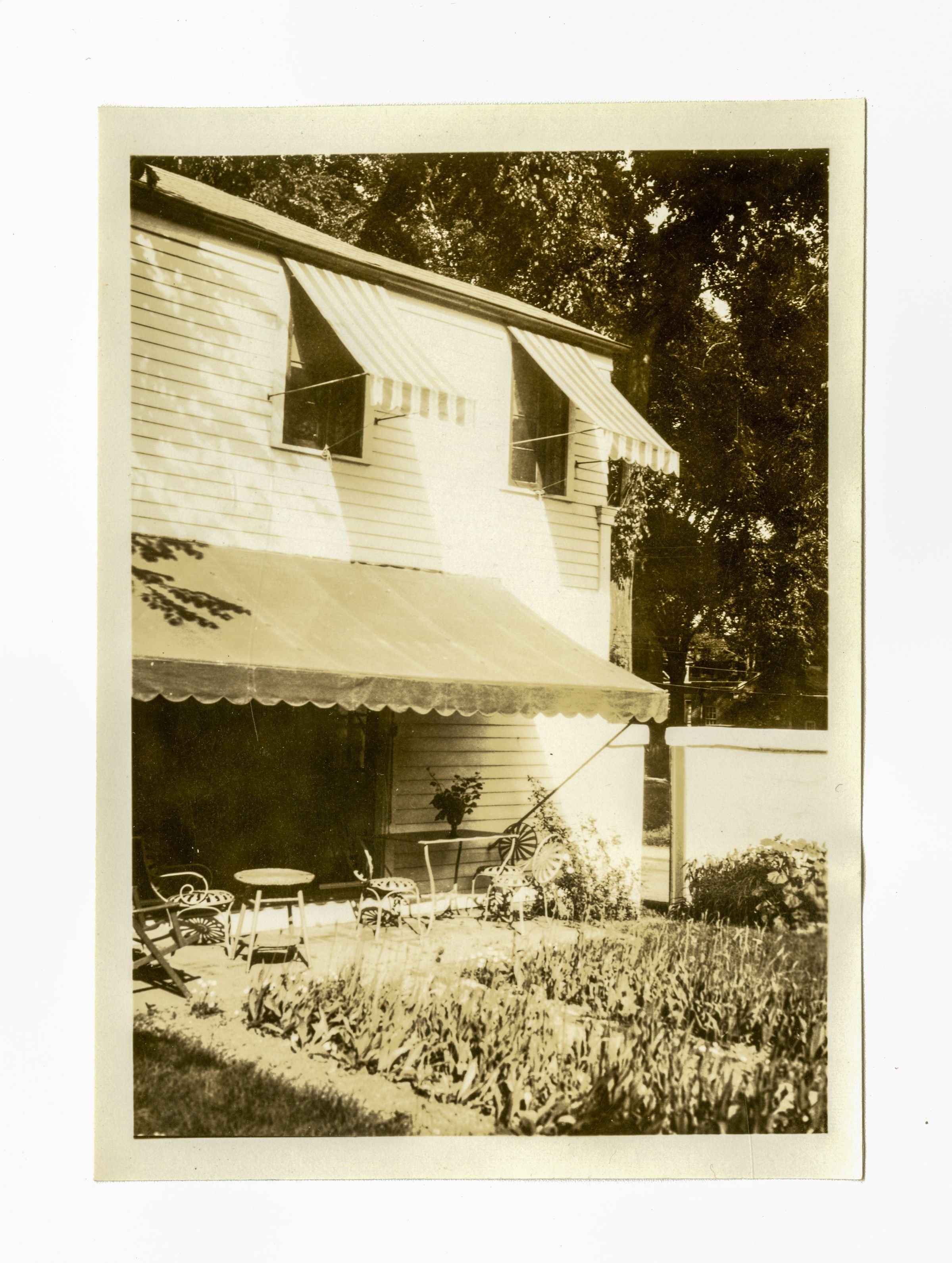 A view from the garden looking towards the house of an awning-covered patio.Collection