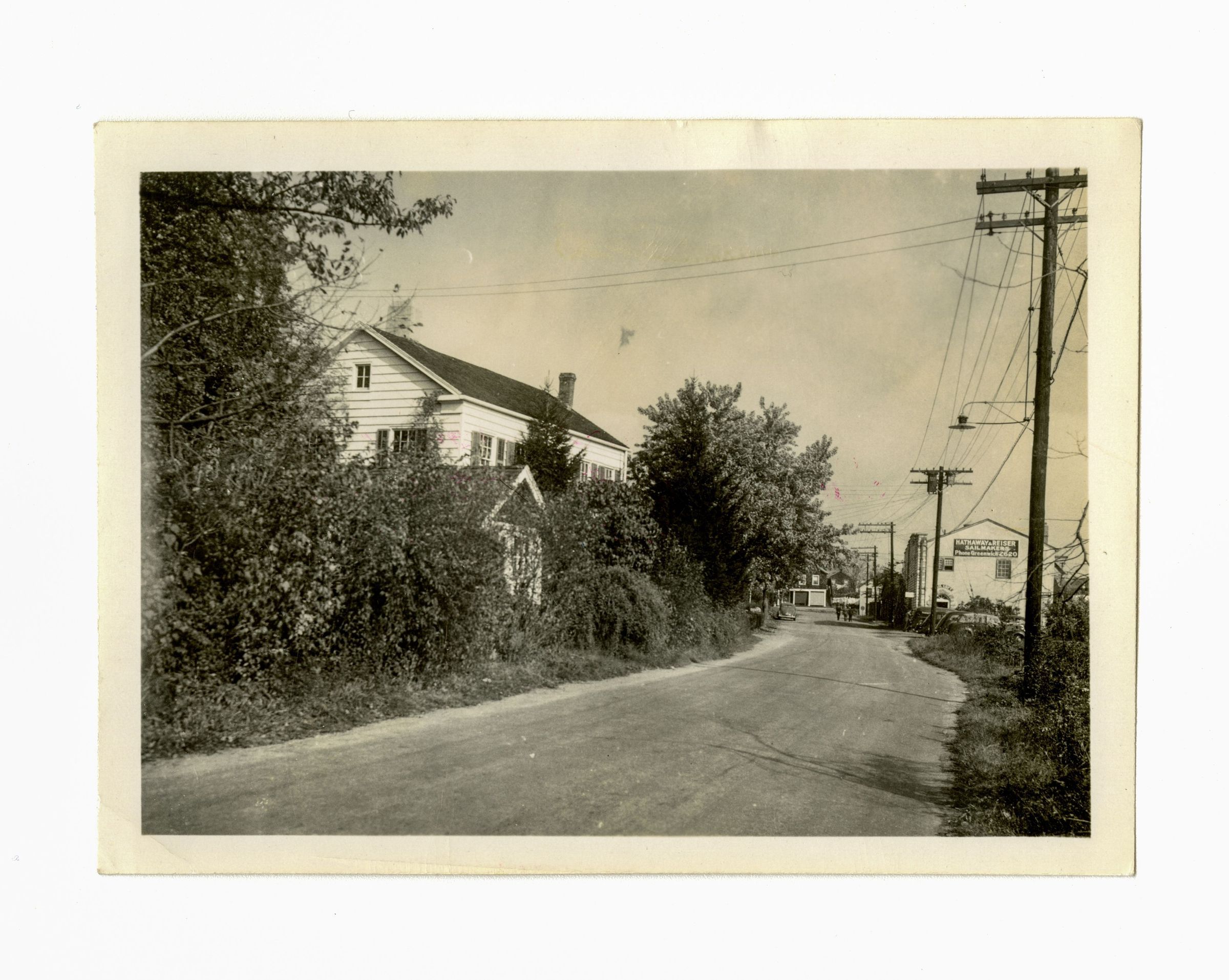 A view looking down River Road towards a three story house on the left of the image and on the right, the Hathaway & Reiser Sailmakers building.Collection