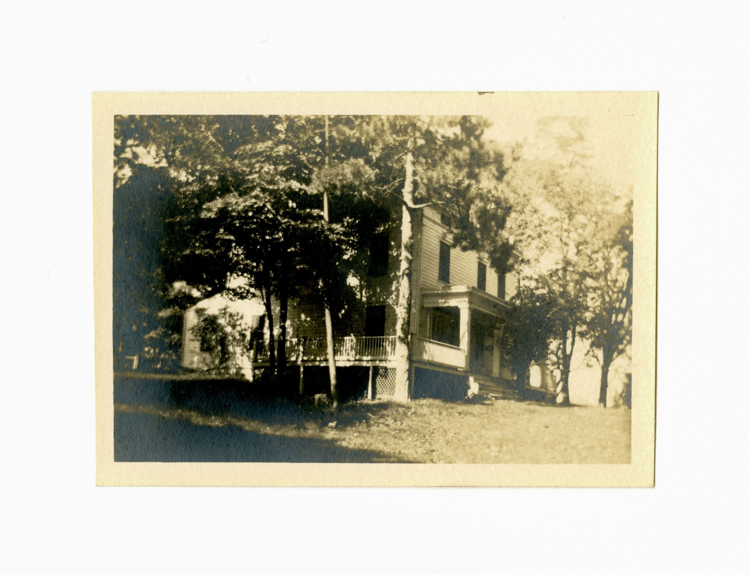 A view of the side of a house with a porch that extends into a deck as seen from its front lawn.Collection