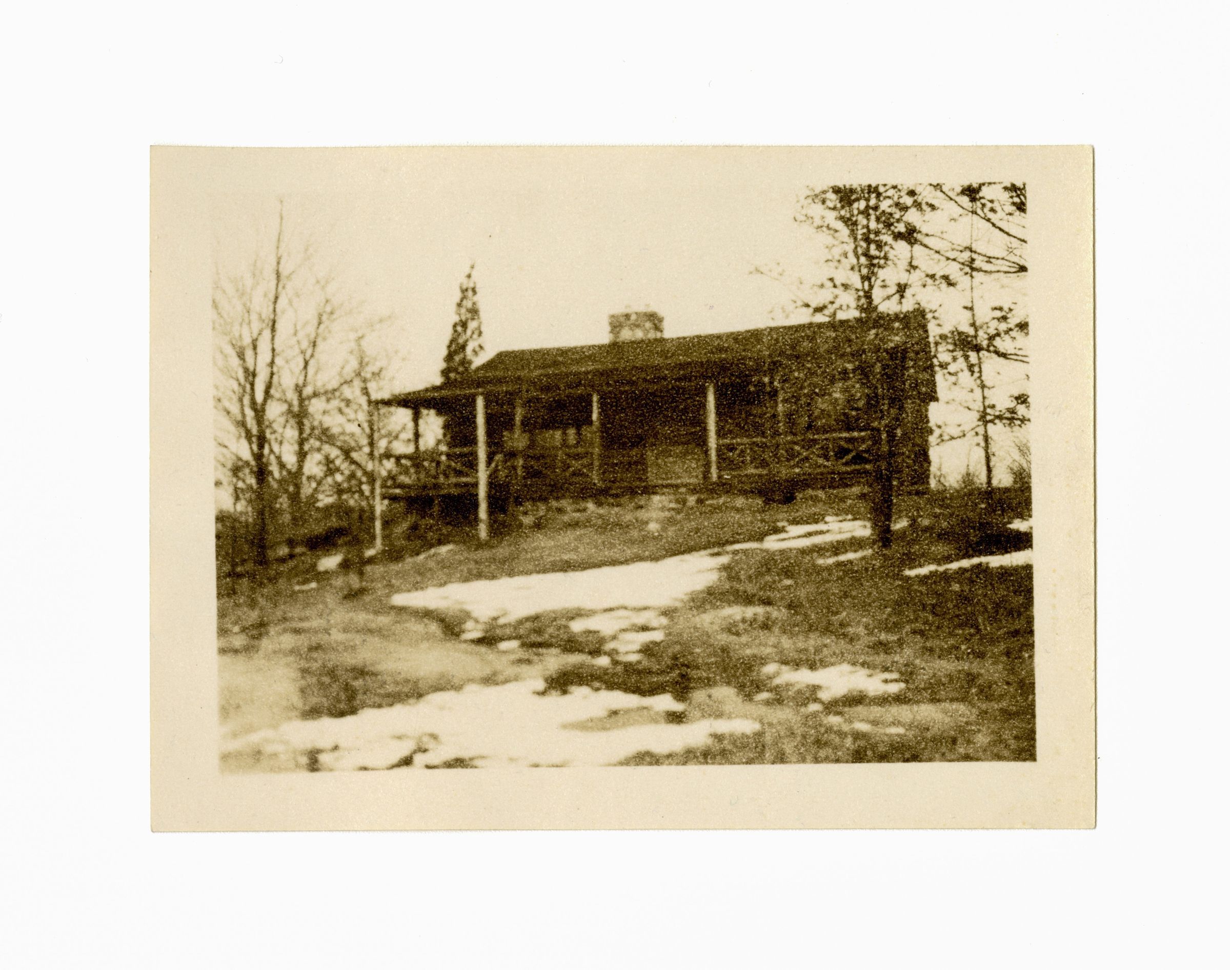 A view of the front of a single story wooden cabin and its porch.Collection