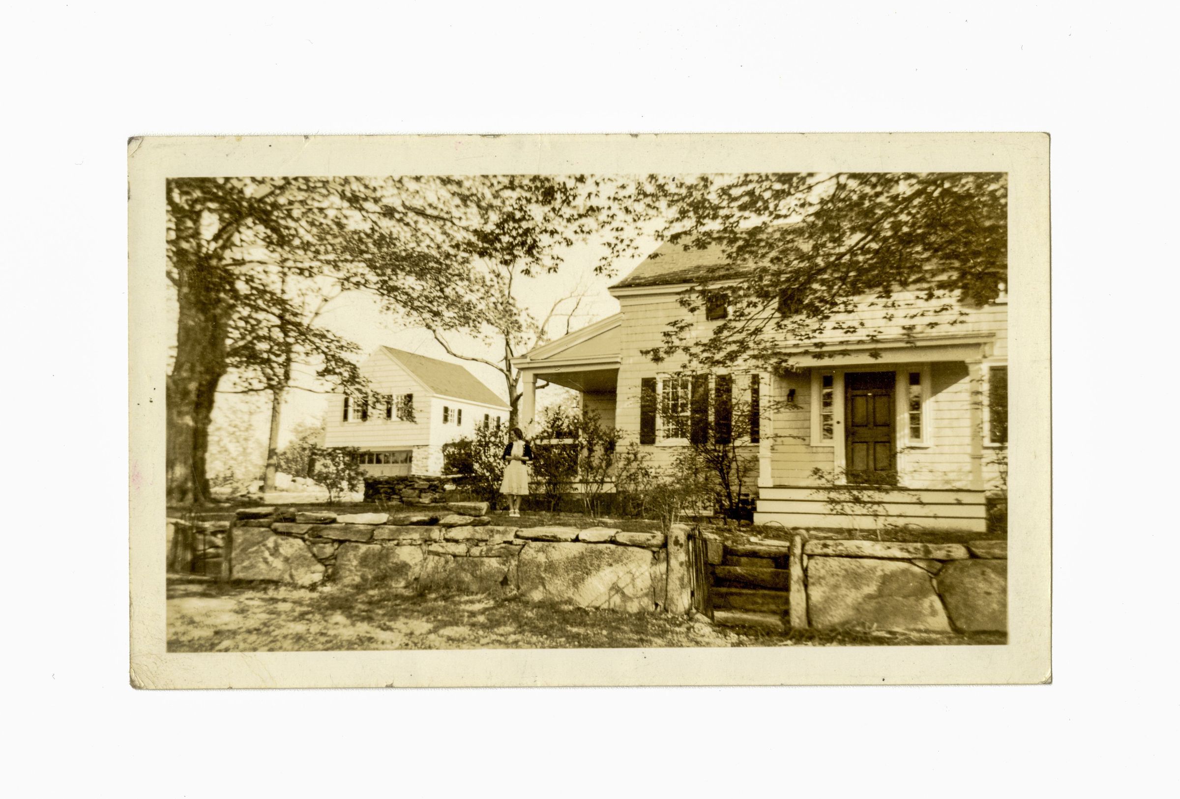 A small two story shingled home with a girl standing in front of a side door and a garage on the left of the image.Collection