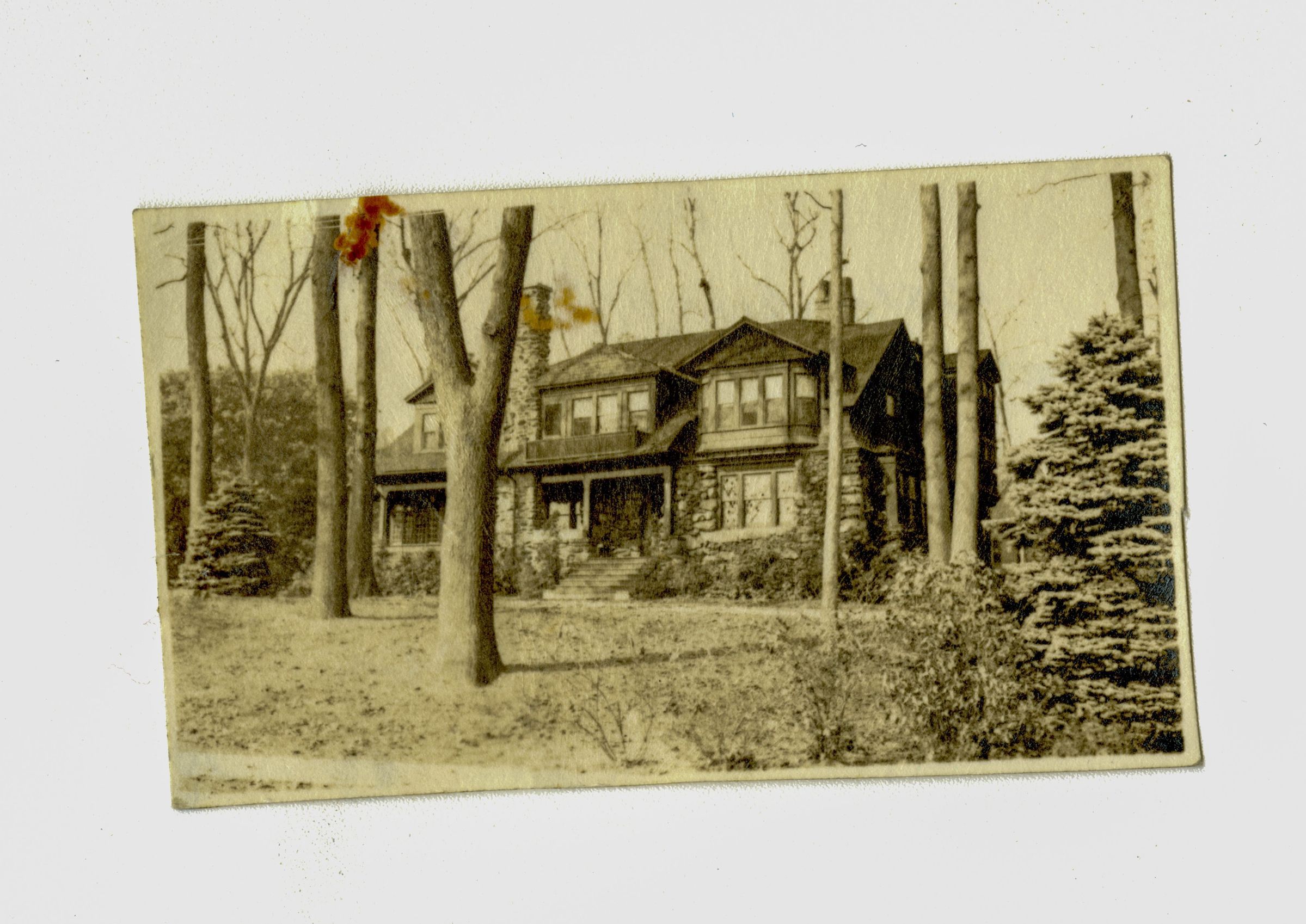 The front of a two story home with stone walls and a stone chimney.