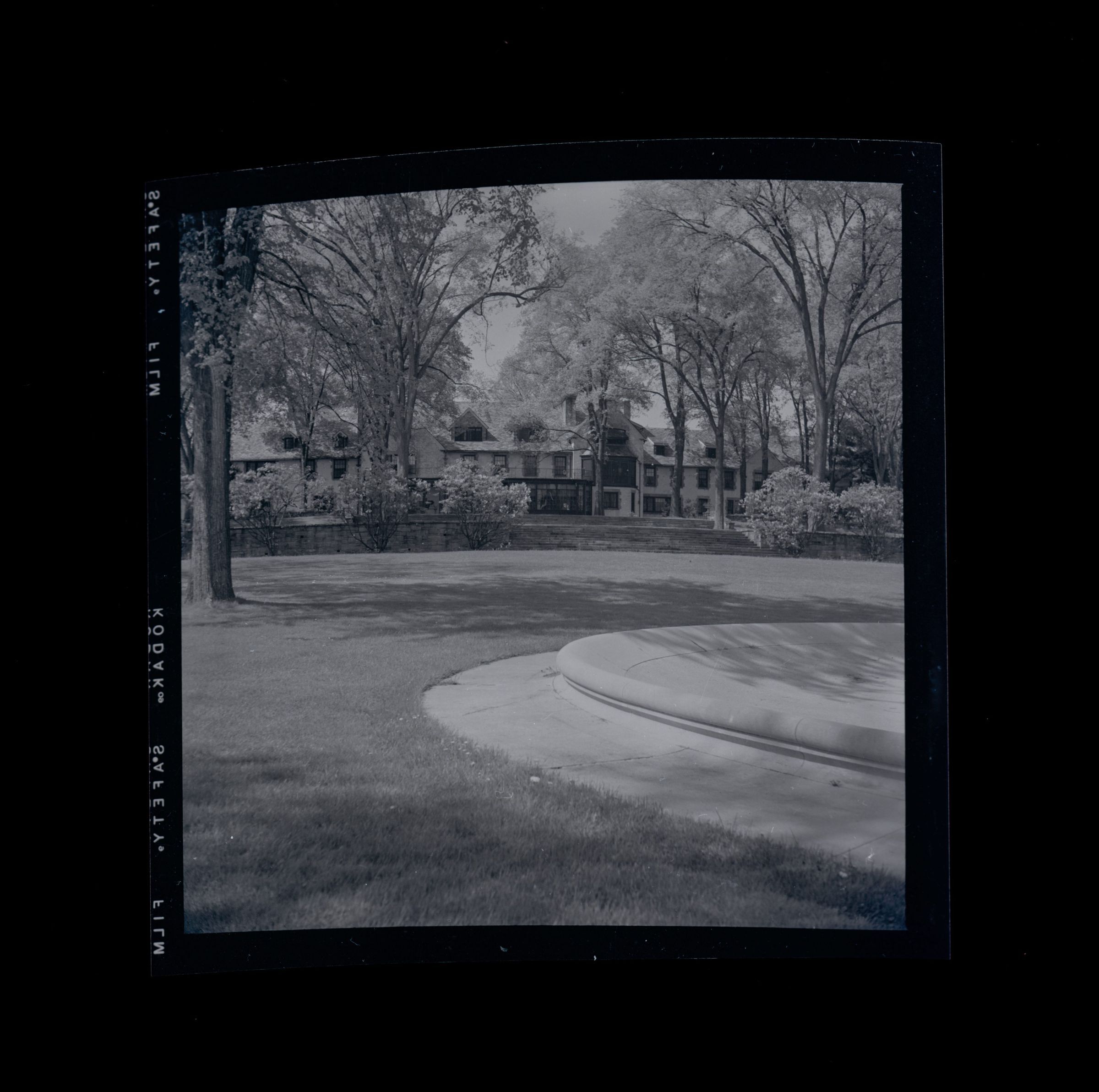A view looking towards the rear of a three story house from its lawn with part of a dry fountain in the foreground.Collection