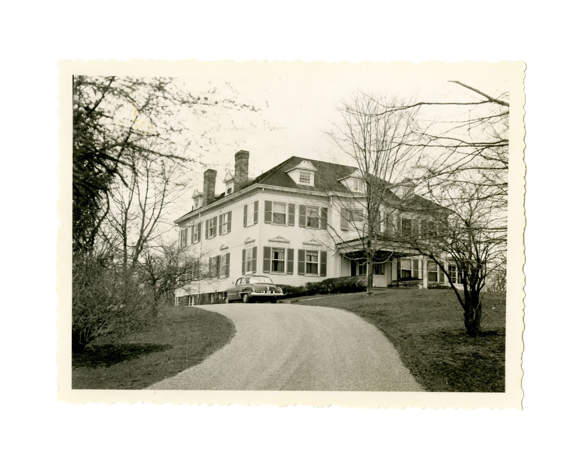 A view from the driveway of a large, four story house with a portico over its entranceway and a car parked in the driveway.Collection