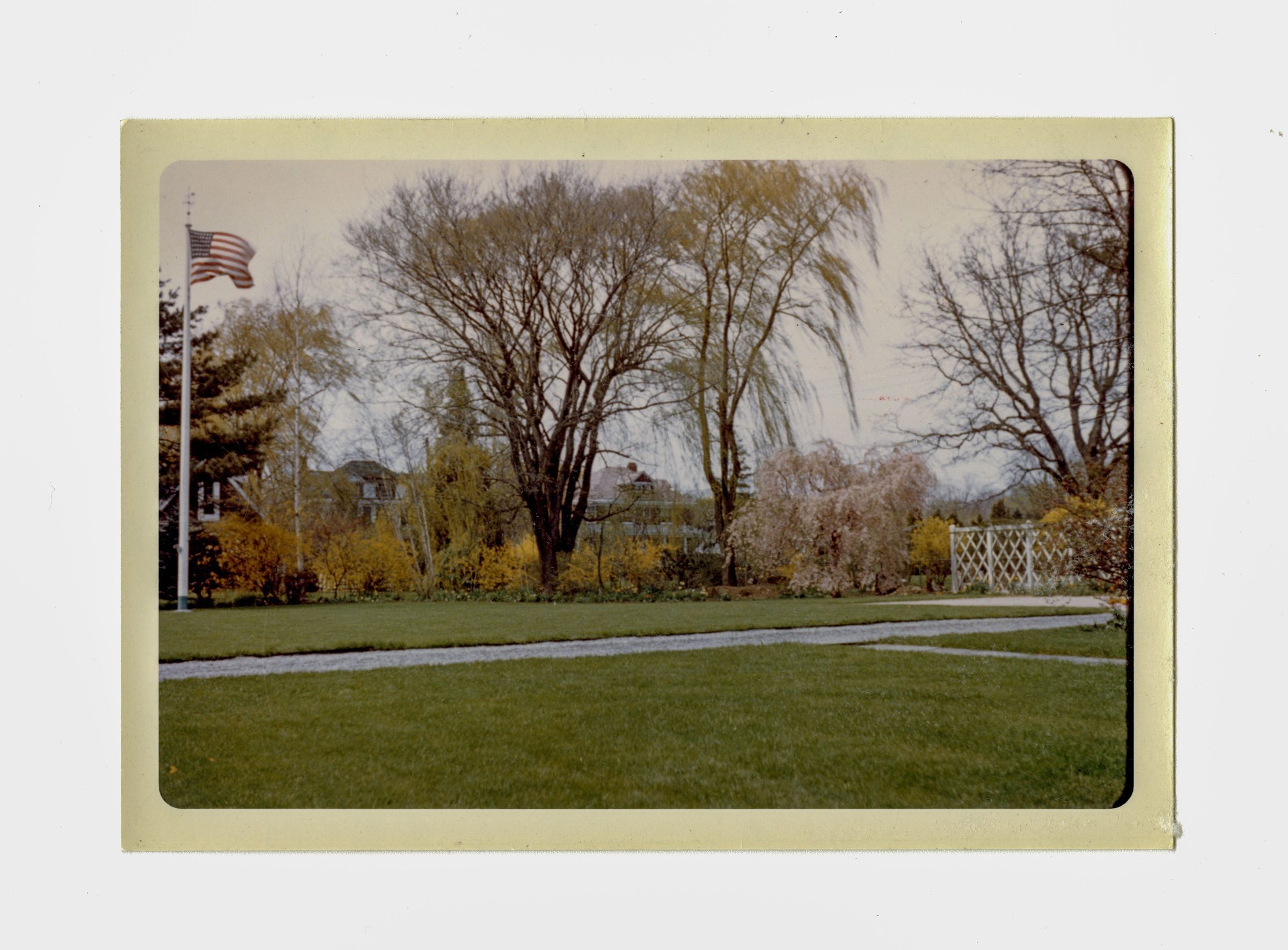 The lawn and gardens of the house with a flagpole on the left of the image.