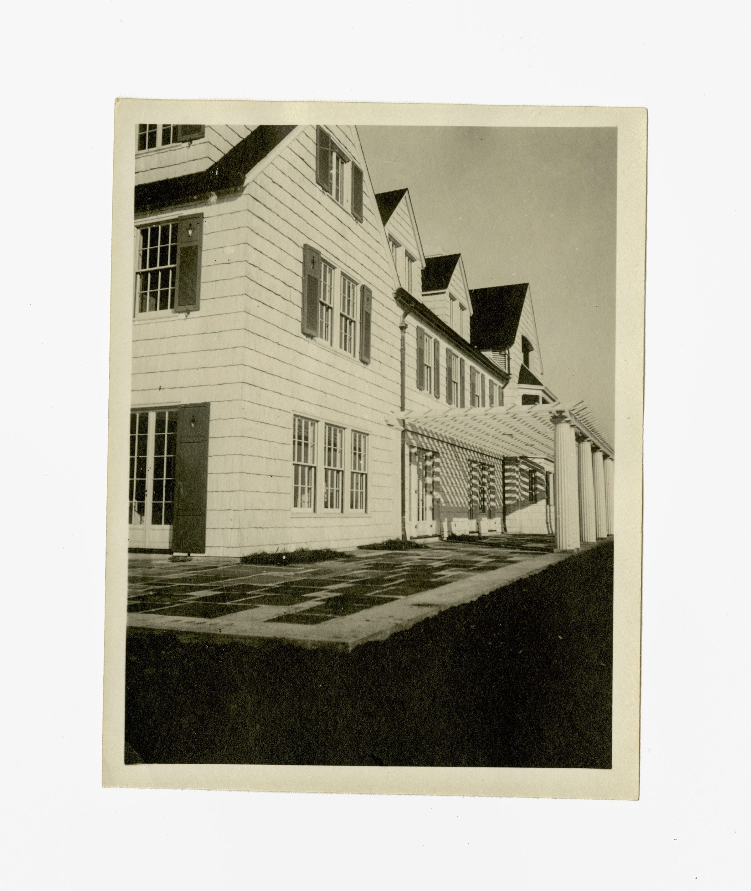 A view of the side of a three story house with a patio partially covered by a trellis.