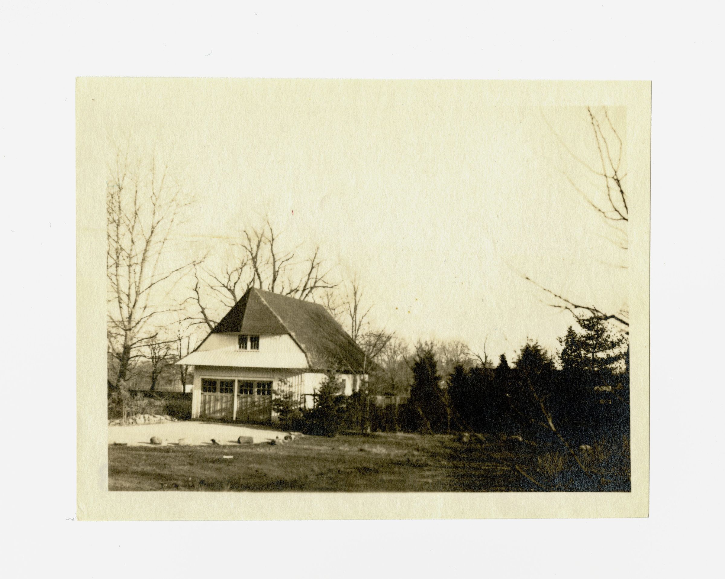 A two door garage and part of the back yard.