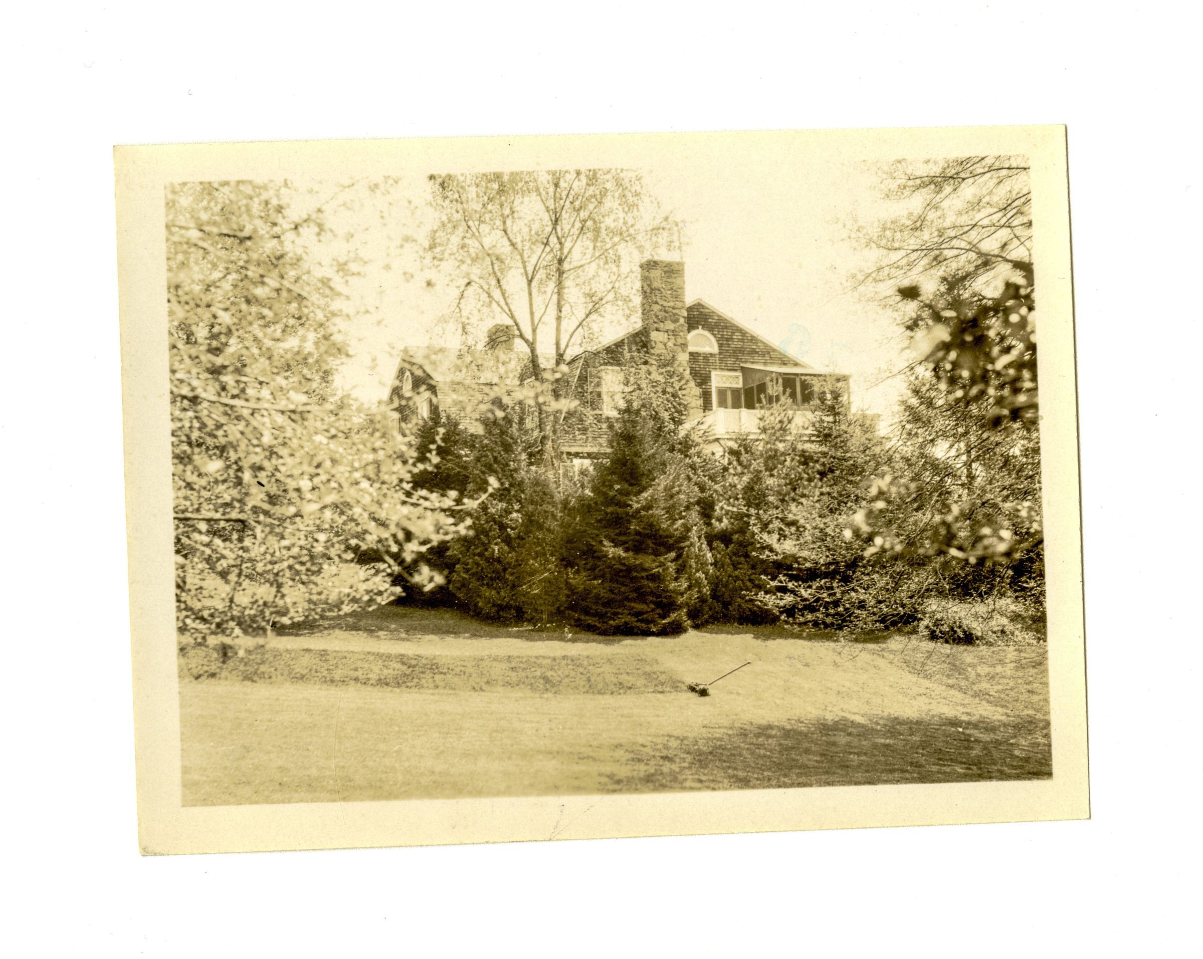 A view of the side of a three story shingle house, partially obscured by trees.Collection