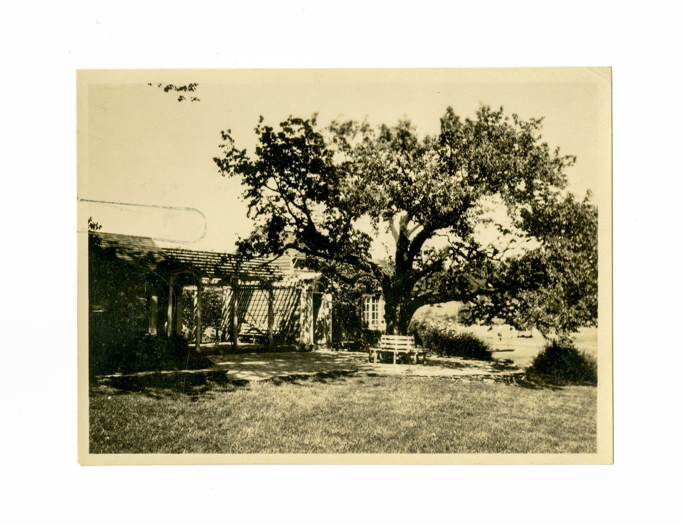 A view of part of the garden and the trellis-covered patio of the residence.Collection
