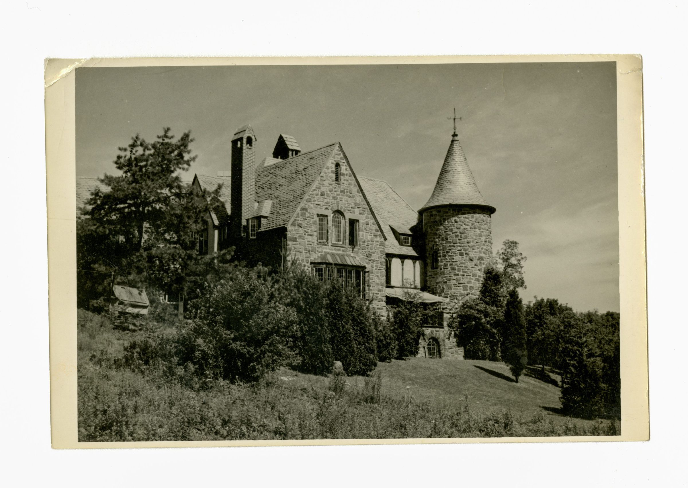 A three story stone house with a stone tower with a conical roof and part of its lawn.Collection