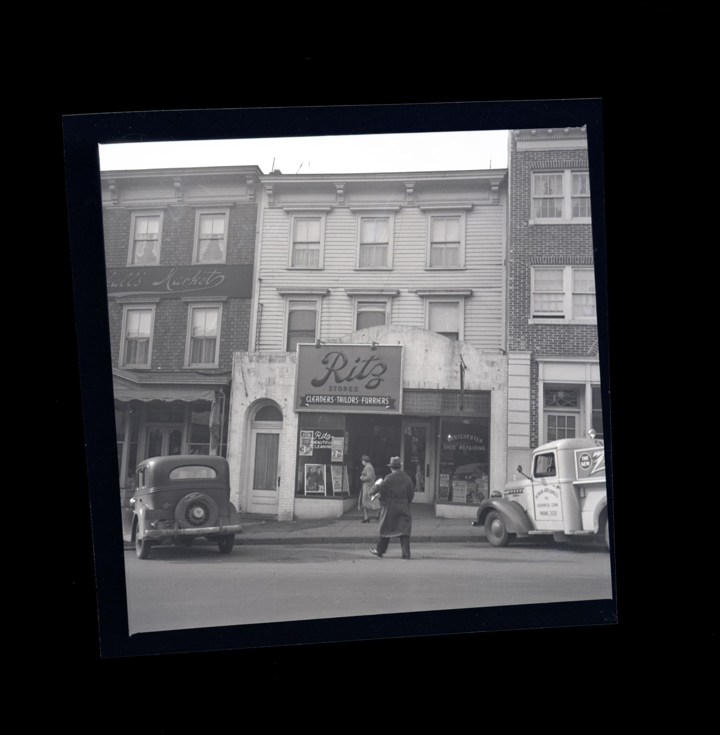 Storefront of Ritz Stores Cleaners Tailors Furriers. The three story clapboard building has an arched facade around the ground floor windows and door. A car and a truck are parked on either side of the store and a man and a woman are walking in front of the building.Collection