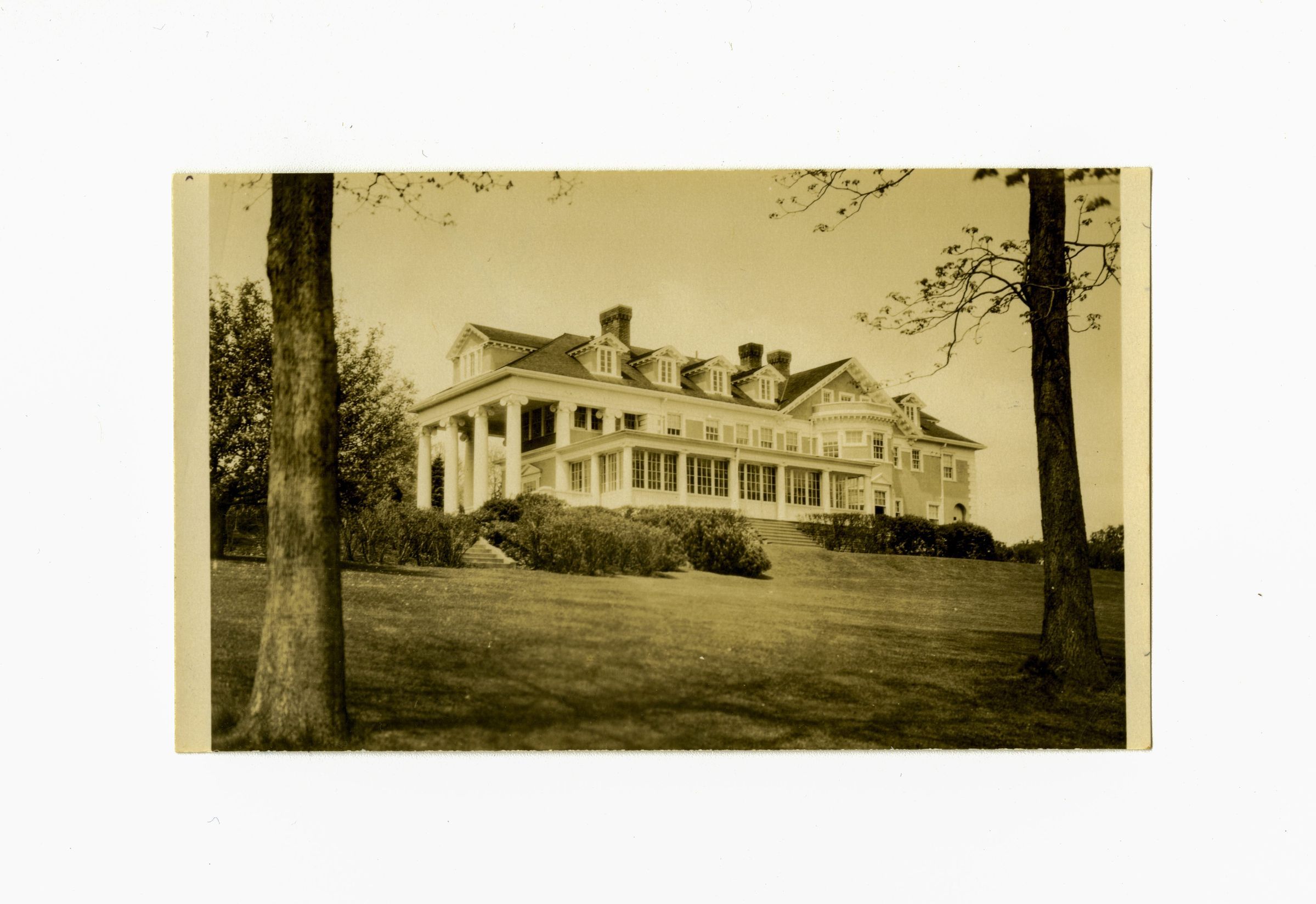 Back view of the mansion with garden and lawn in the foreground.Collection
