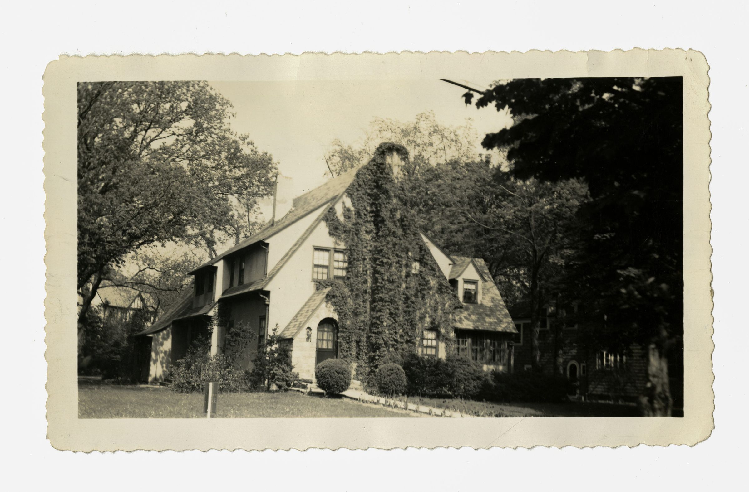 A side view of a two story home and its lawn; the chimney and part of the walls are covered in ivy.Collection