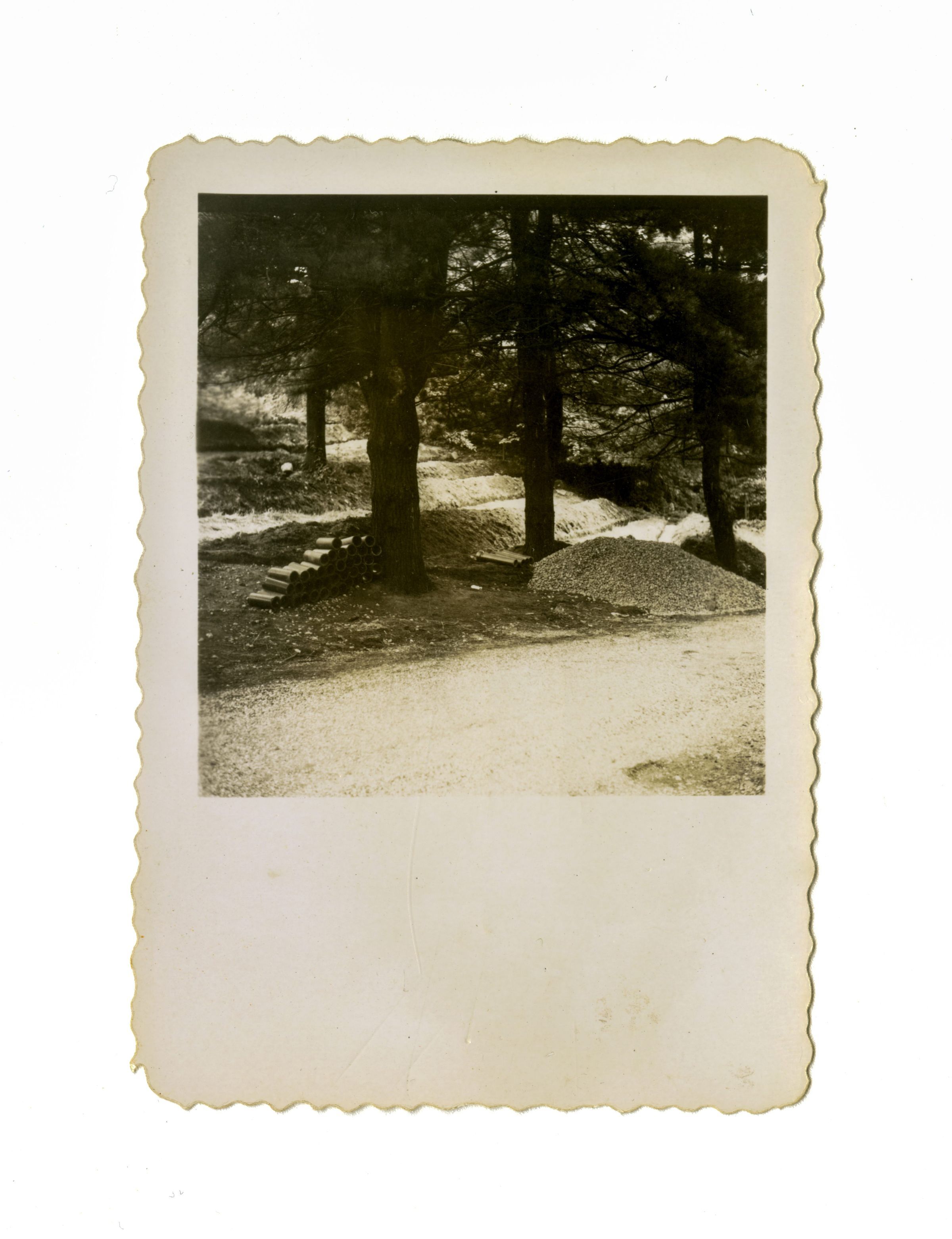 A pile of gravel and stacks of piping underneath pine trees, next to a road.