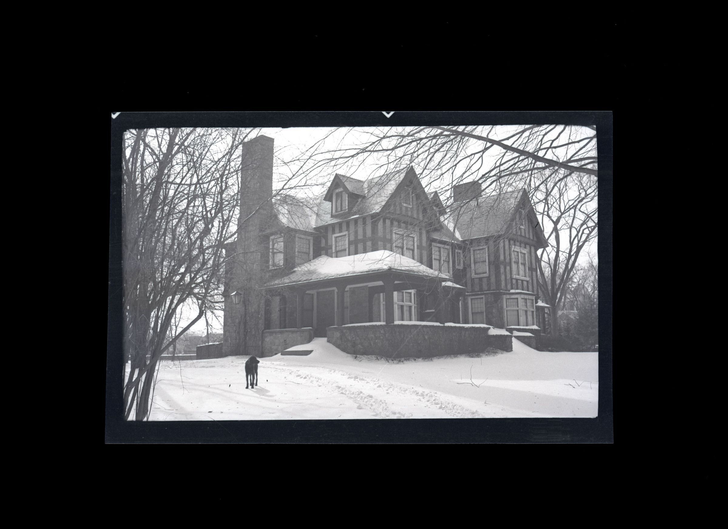 A three story house in the snow. A dog is walking in the foreground of the image.