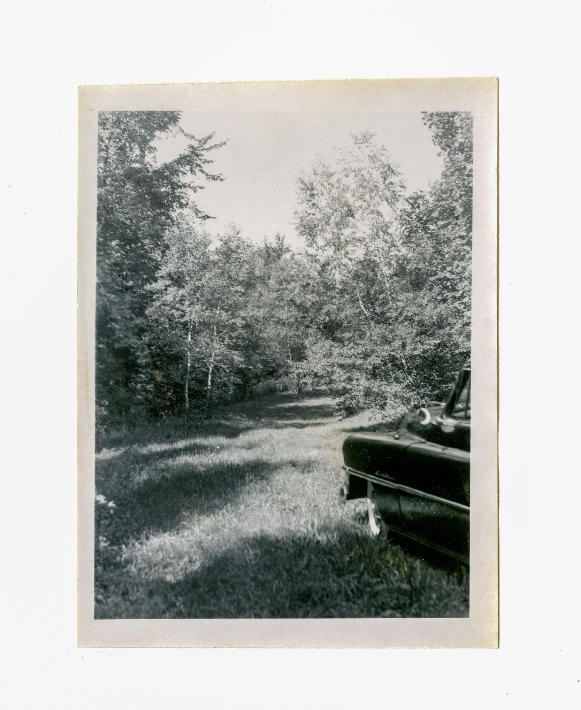 A clearing surrounded by trees with the front of a parked car in the right corner of the image.Collection