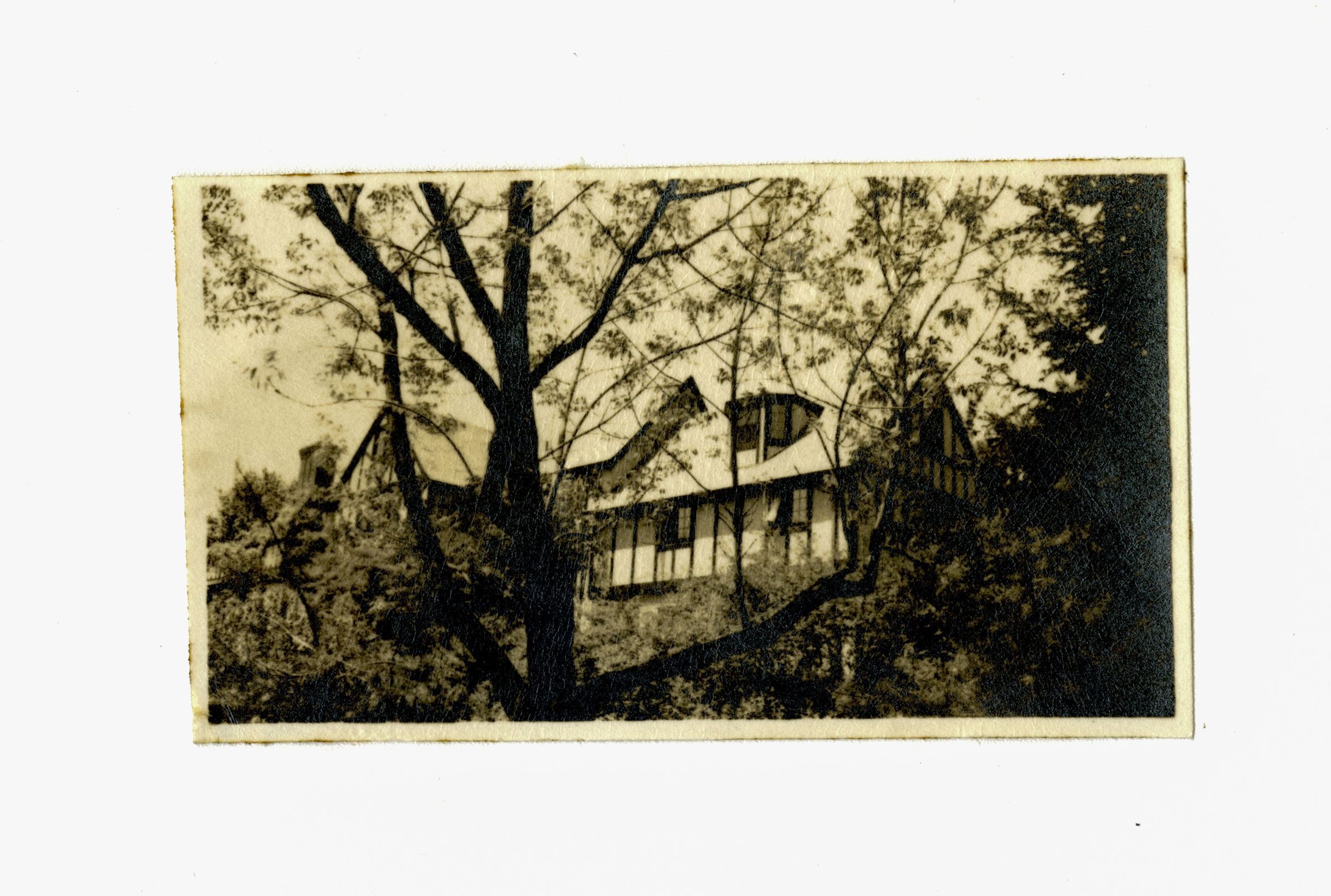 A view of an end of a three story English-style house, partially obscured by trees.Collection