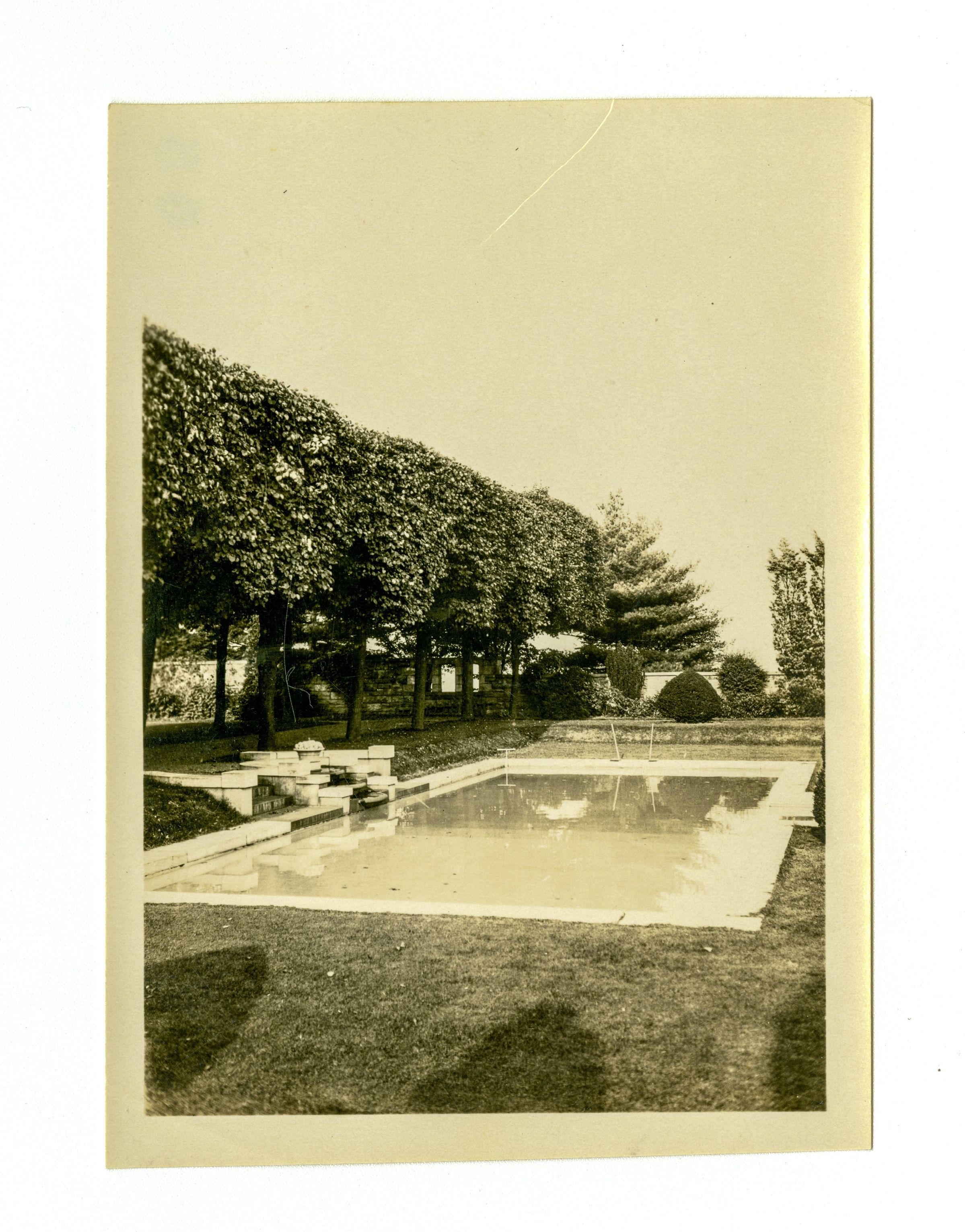 A decorative pool in the gardens with a row of trees pruned into rectangular forms alongside it.Collection