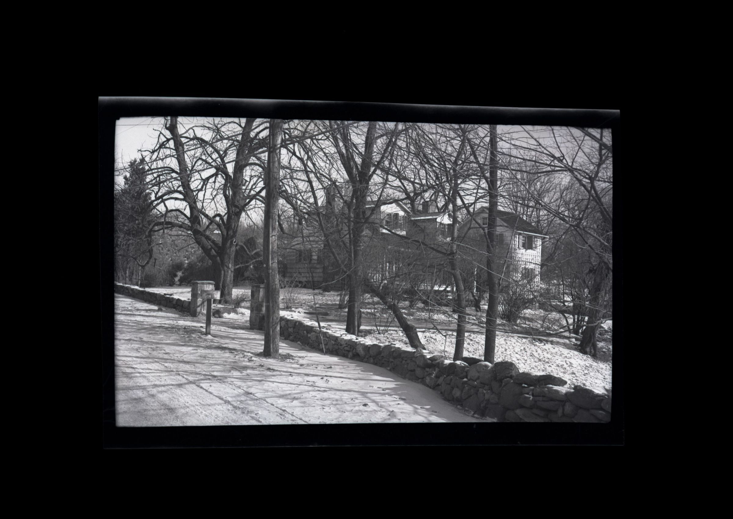 A two story house with dormers viewed from the street, looking through a number of trees on the property.Collection