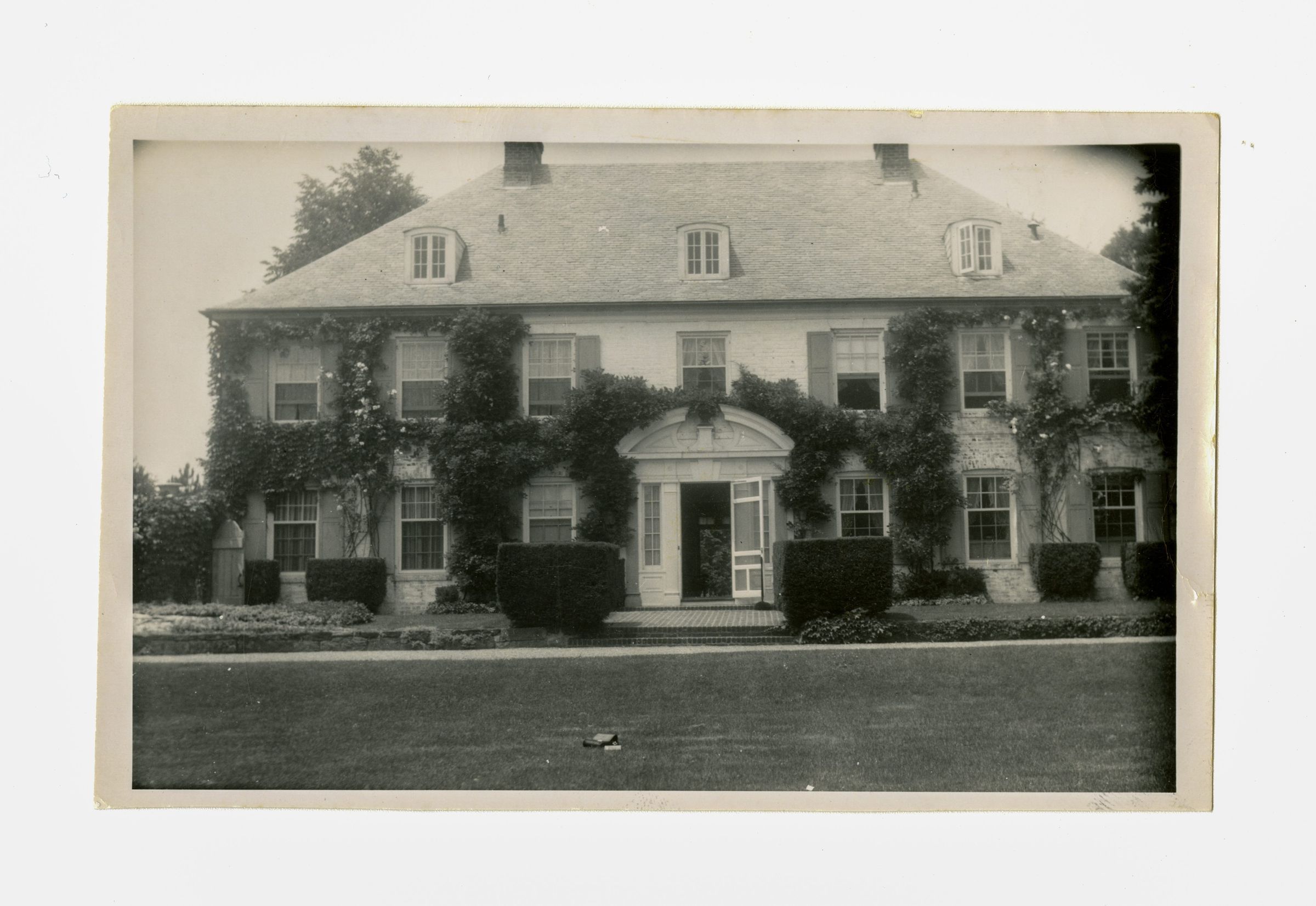 A three story brick Colonial house with ivy and climbing roses covering part of its facade.Collection