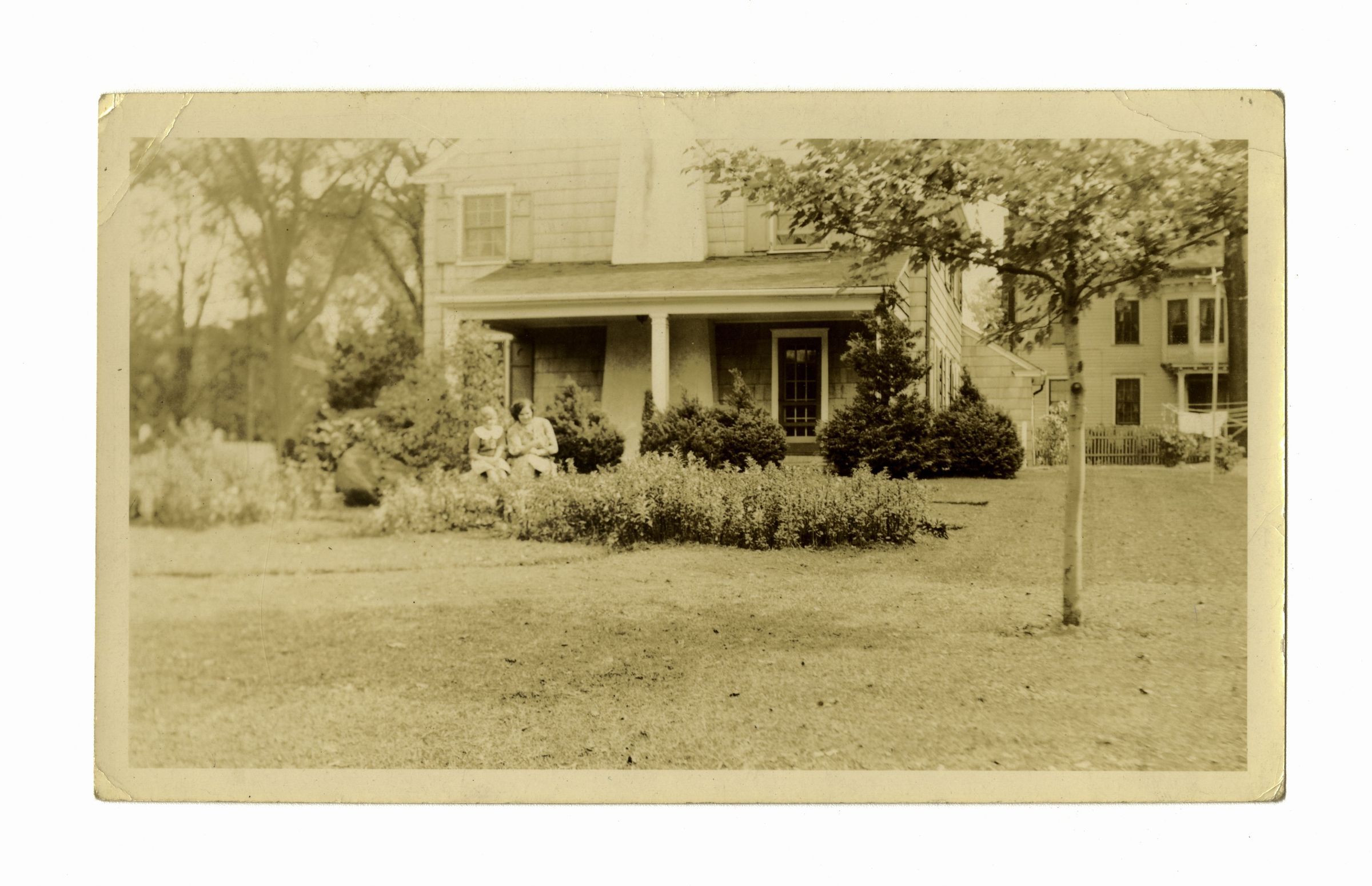 A view of the garden of a three story shingle house. A woman and girl are sitting in the garden.Collection