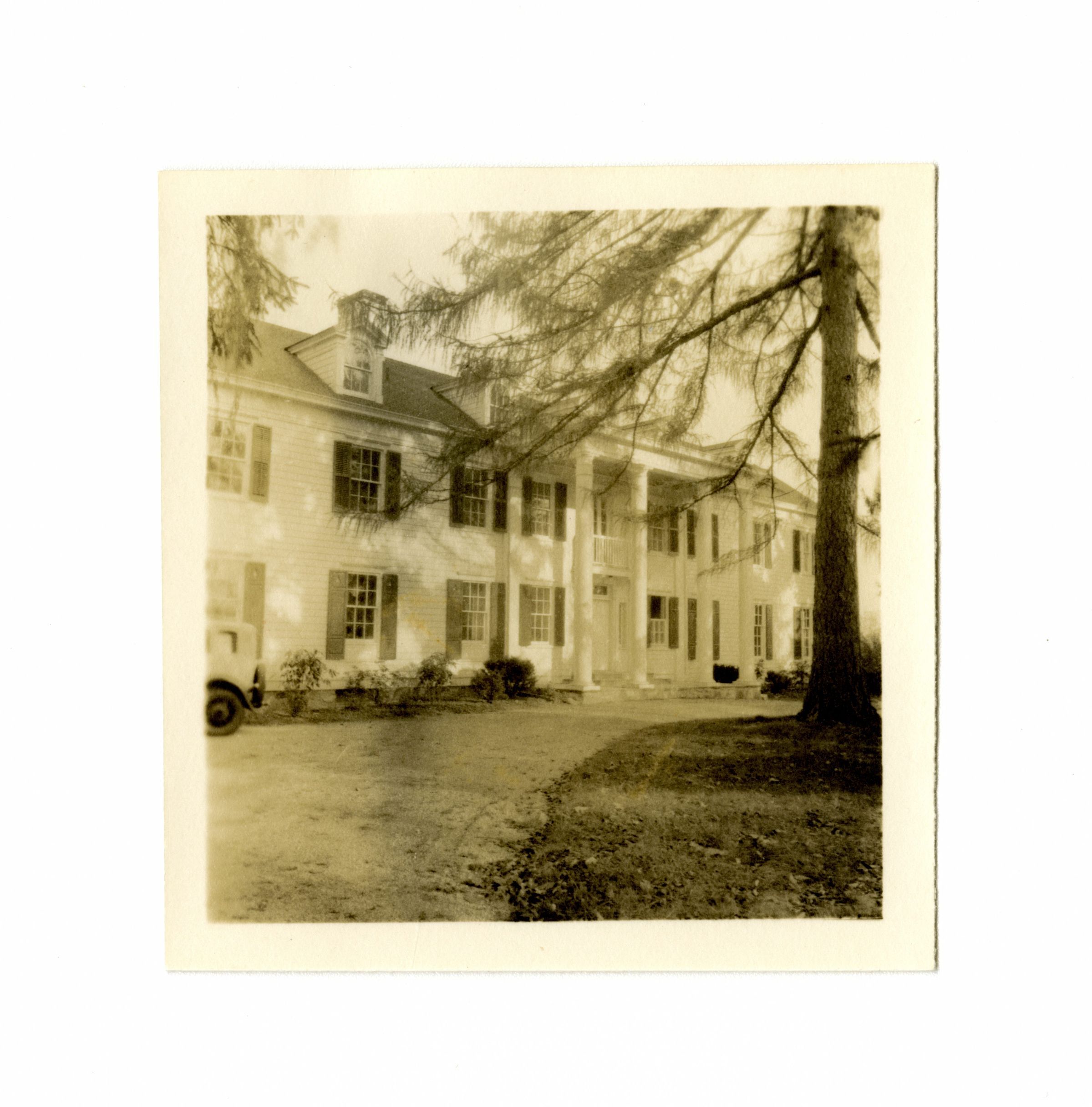 The front of a three story house with a portico over its entrance. The back of a car parked on the driveway is visible on the left side of the image.Collection