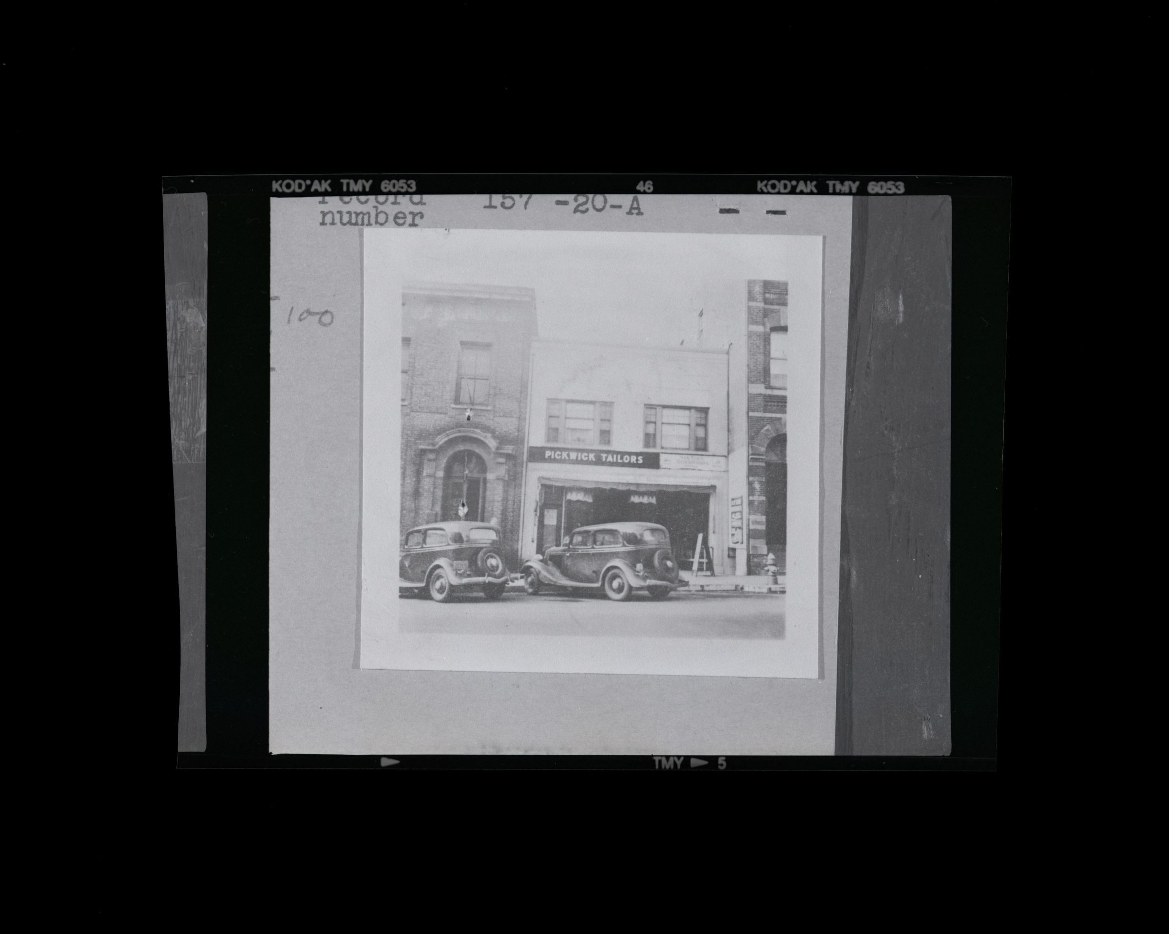 The shopfront of Pickwick Tailors with two cars parked in front.