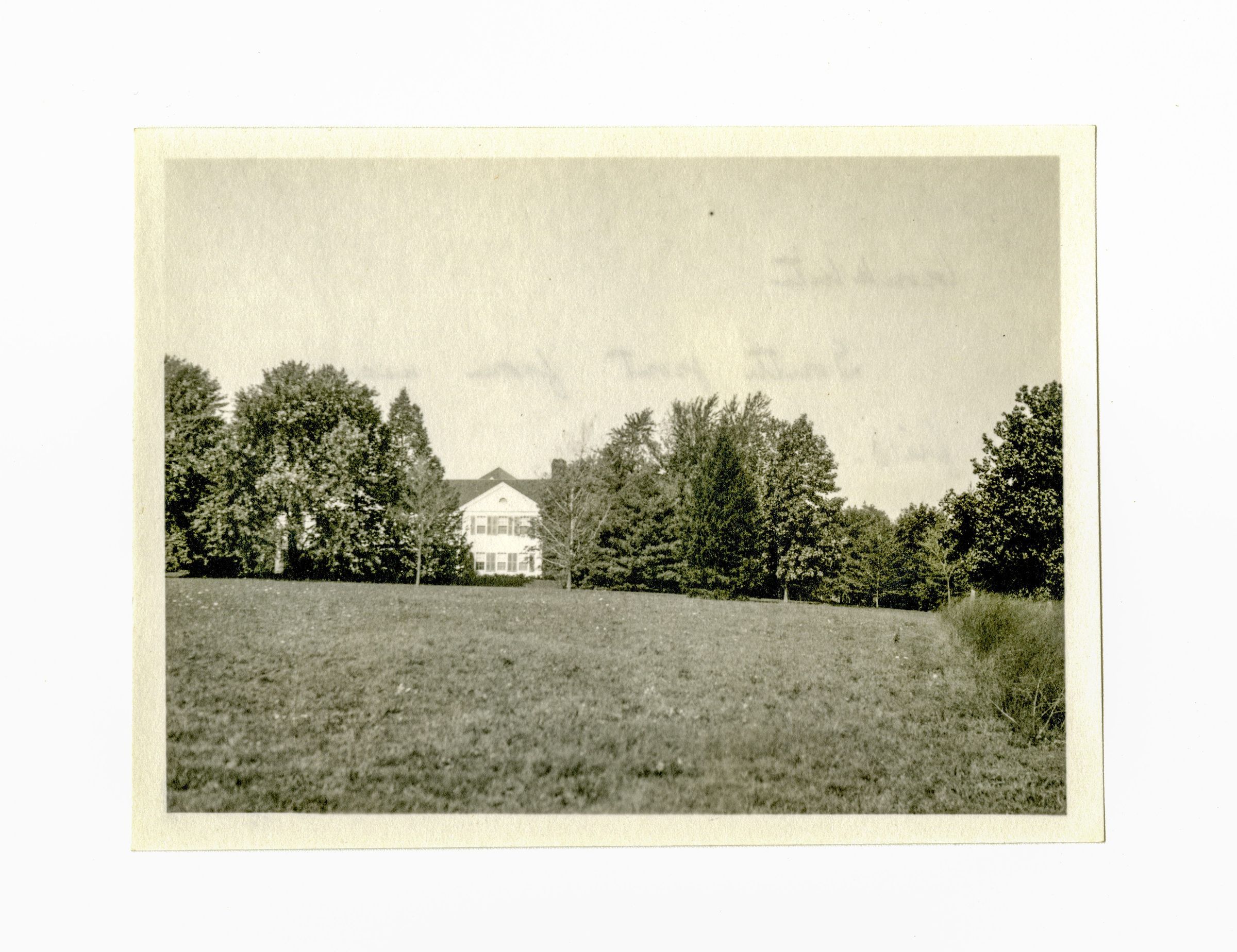 A view of part of a three story house from a field on the property. The house is largely obscured by trees.Collection