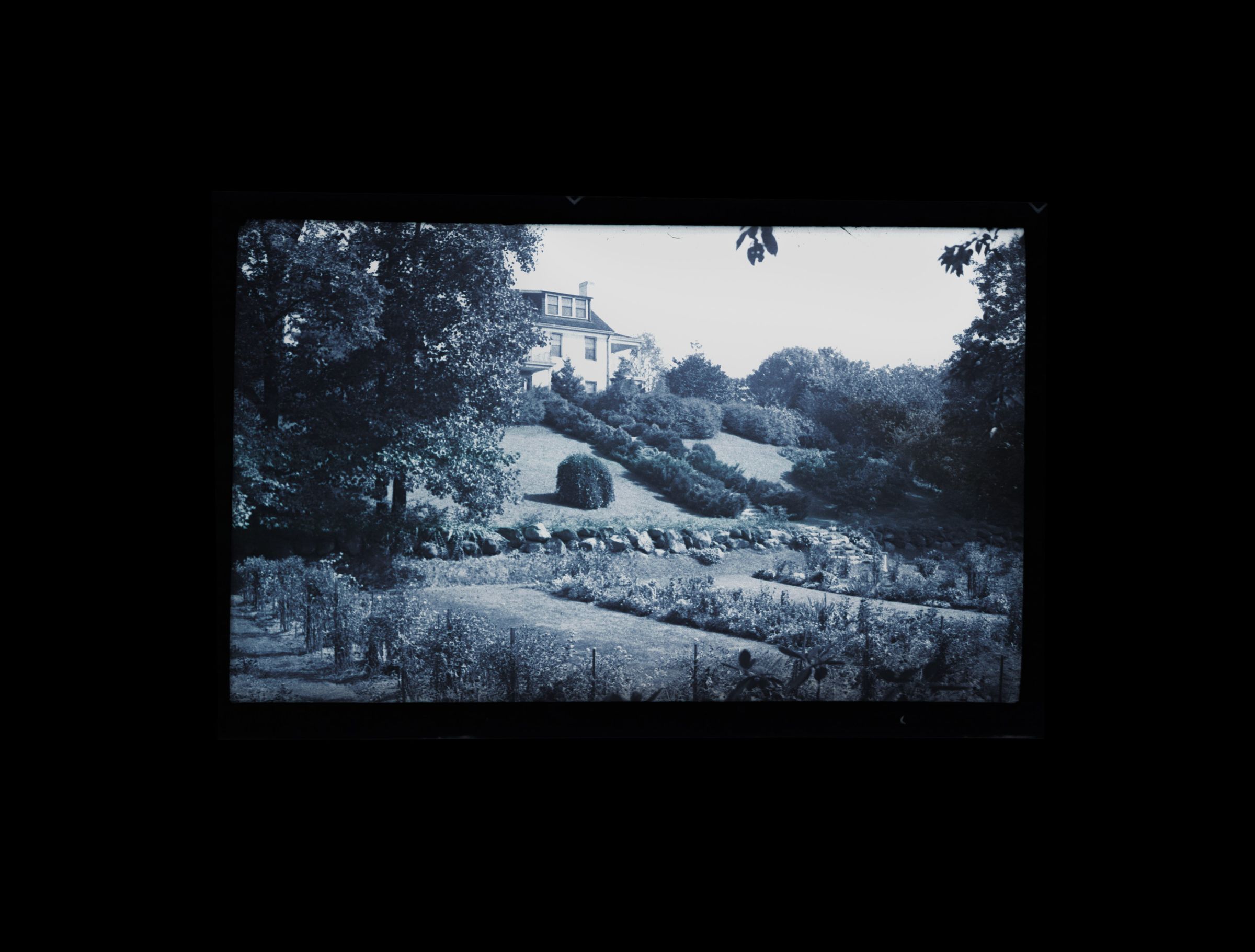 A view of the gardens of the property with a section of the house visible at the top of a hill.Collection