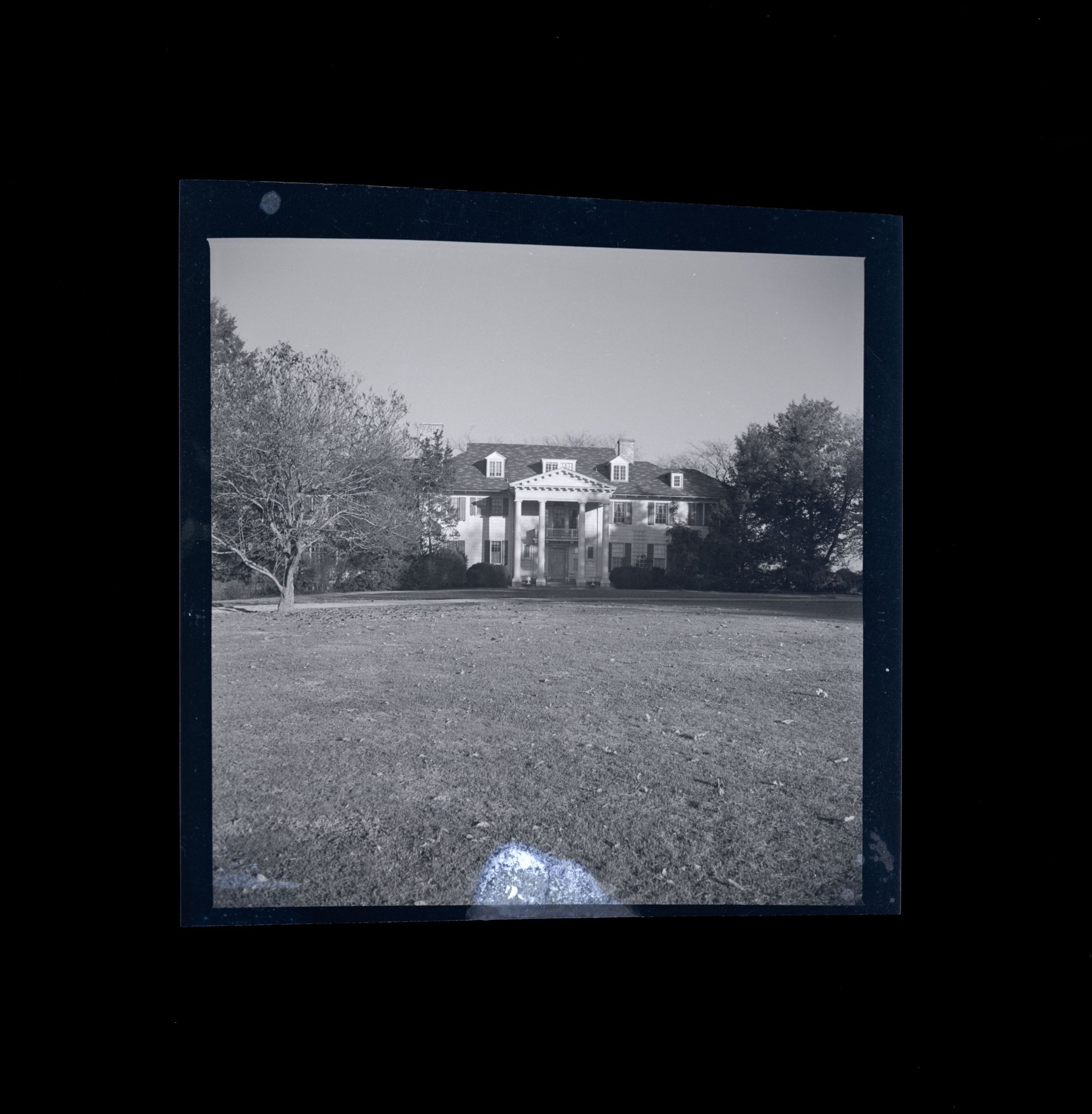 A view from the front lawn of a three story house with a large portico over its front door.Collection