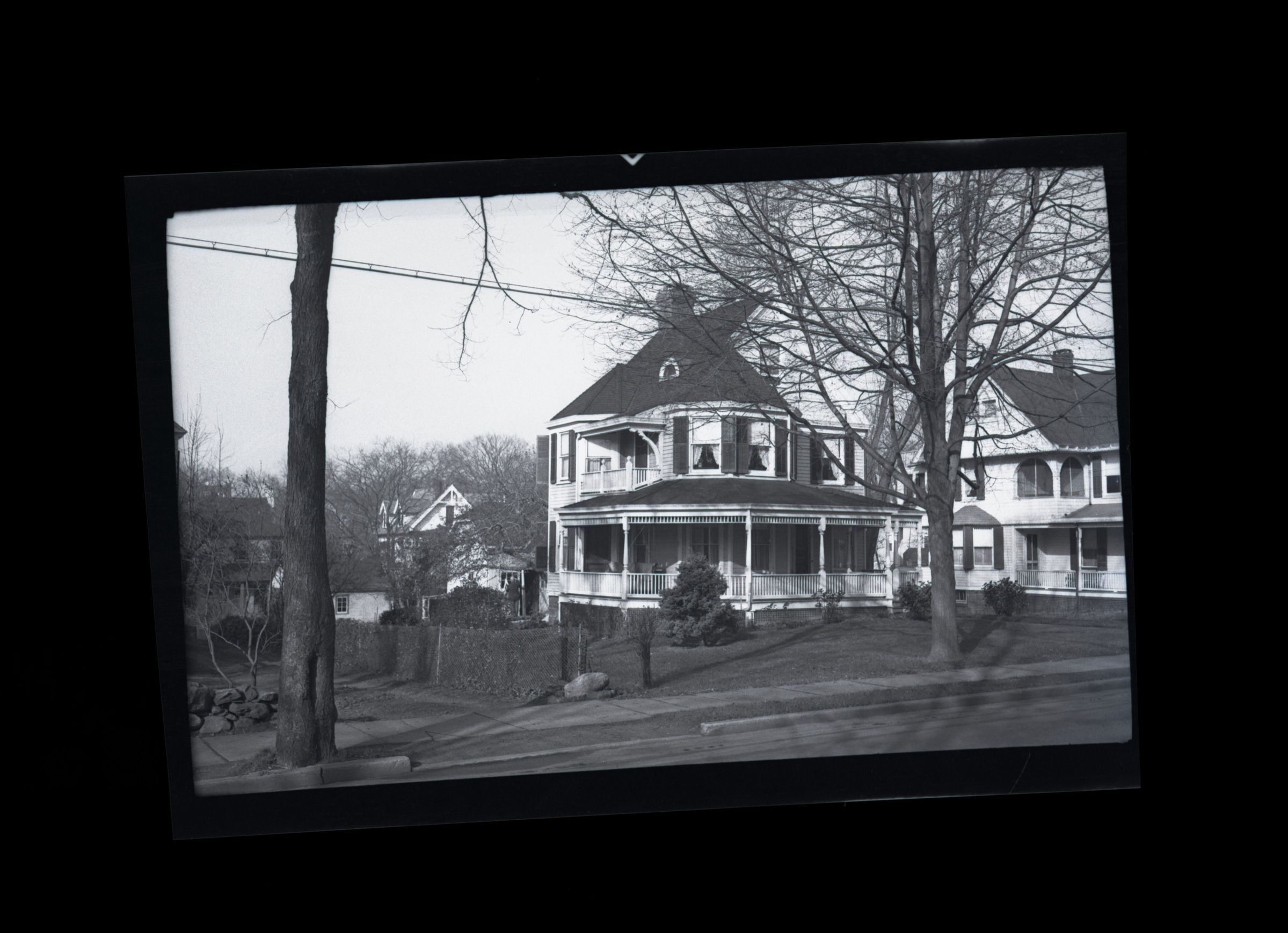 A three story house with a wraparound porch and second floor balcony viewed from the street.Collection