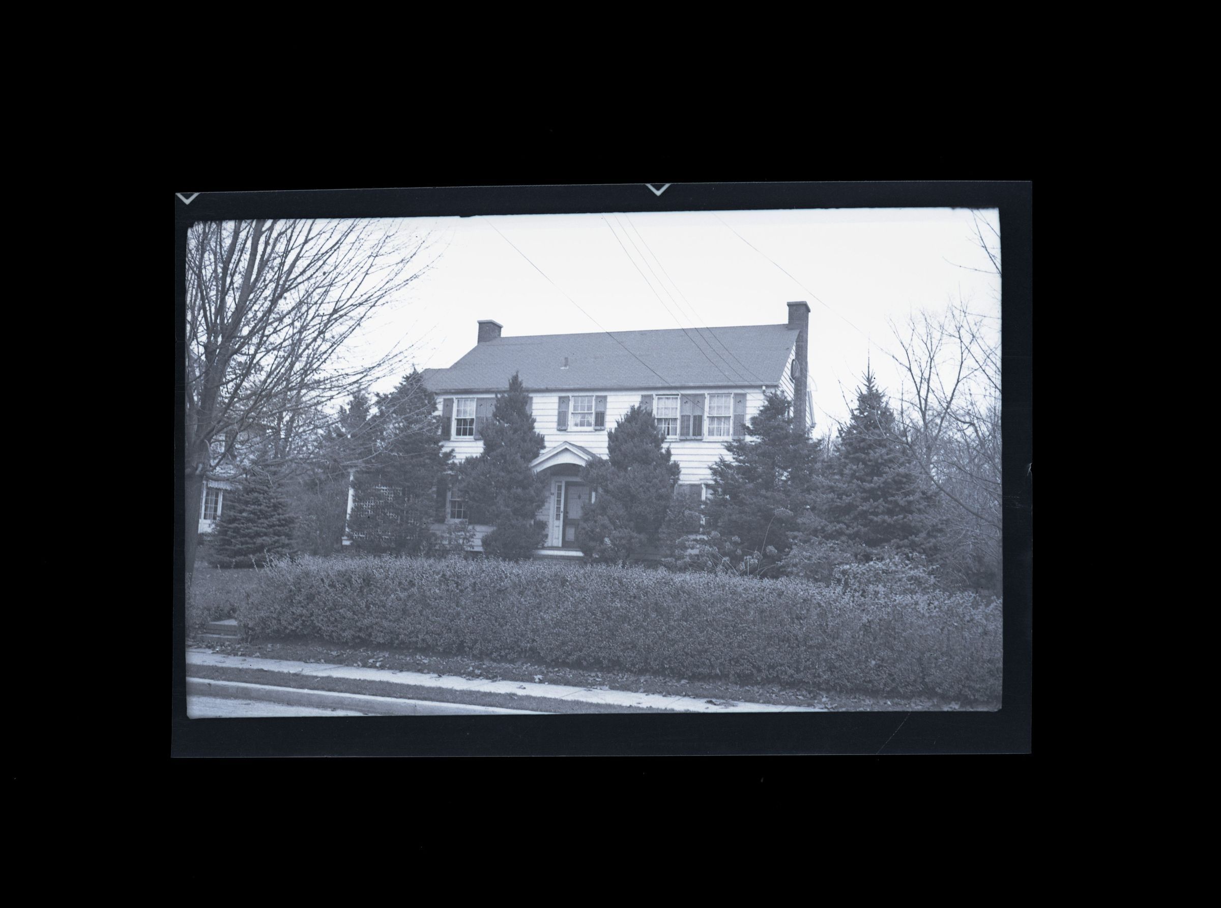 A two story house with pine trees in front of it and a hedge by the sidewalk as seen from the street.Collection