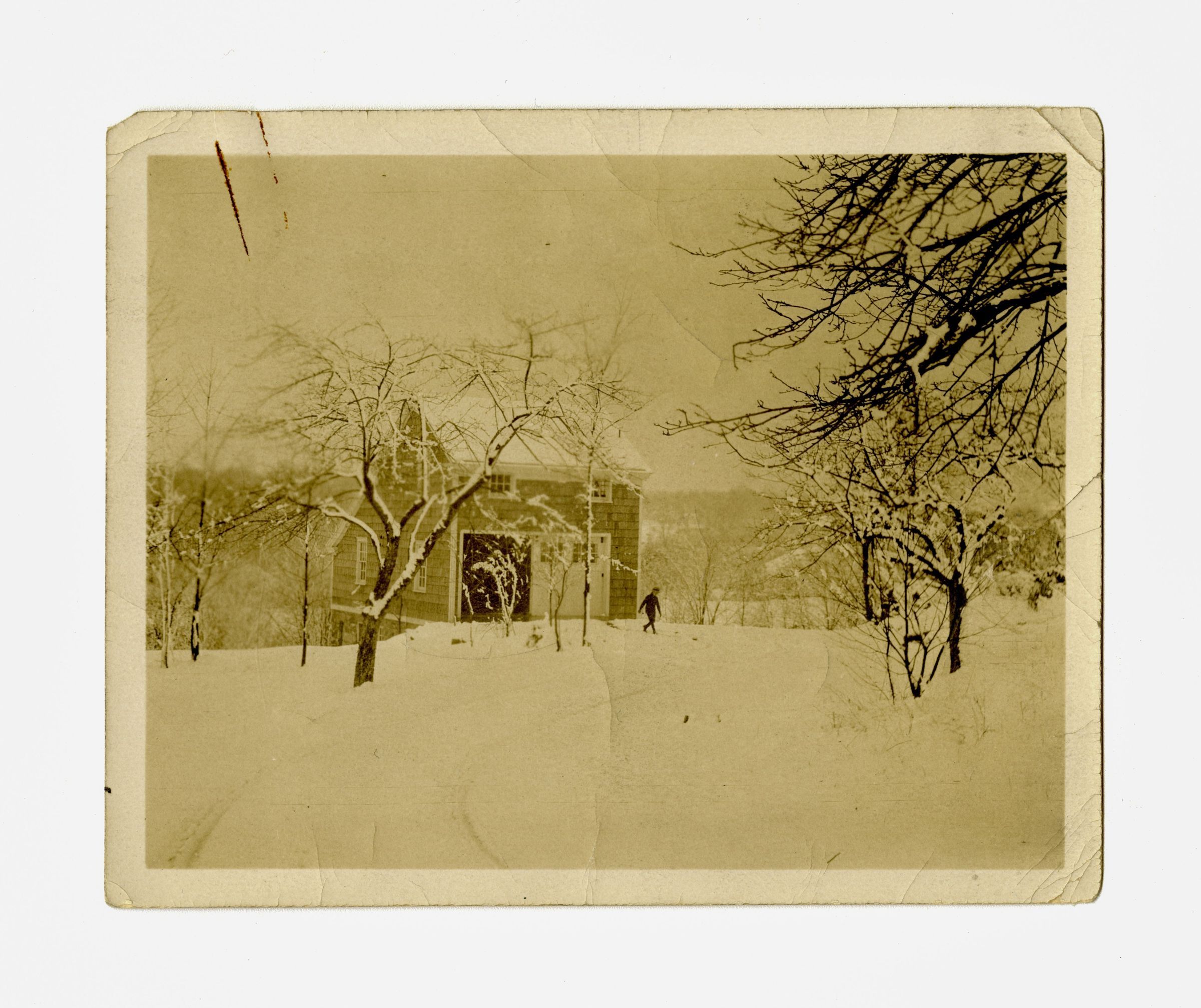 A building with a two door garage on the property in the snow. A person is walking away from the building.Collection