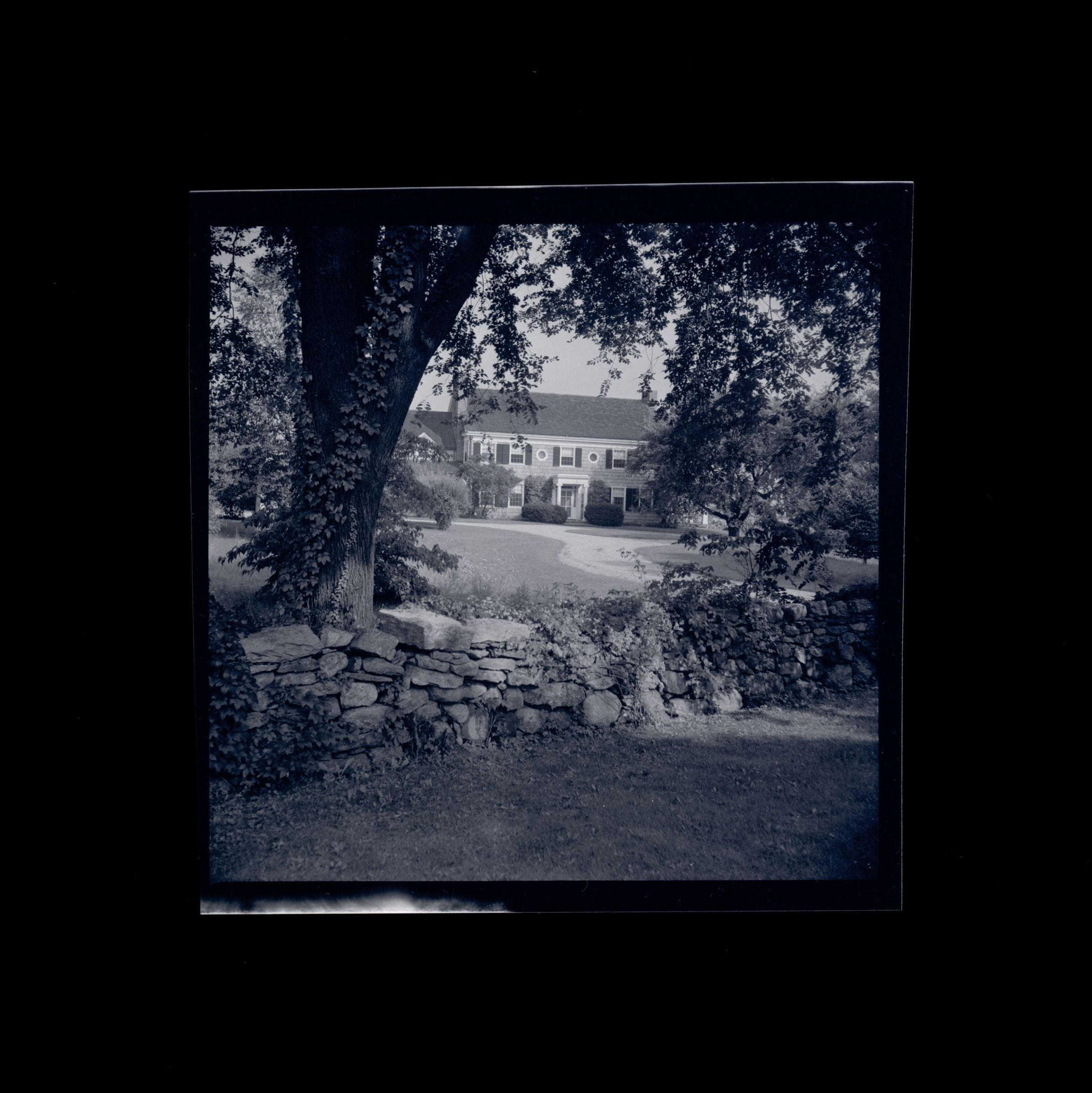 A view looking across across the lawn and driveway of a two story shingle house. A low stone wall is in the foreground of the image.Collection