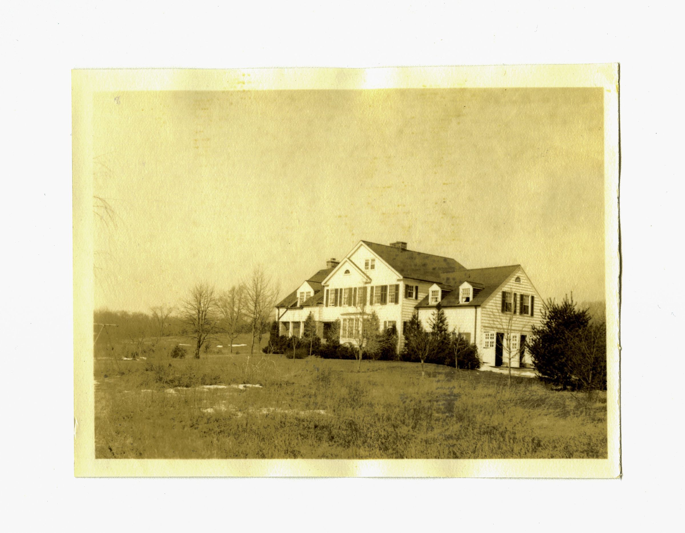 The back of a large, three story house with a two door garage and its lawn.Collection