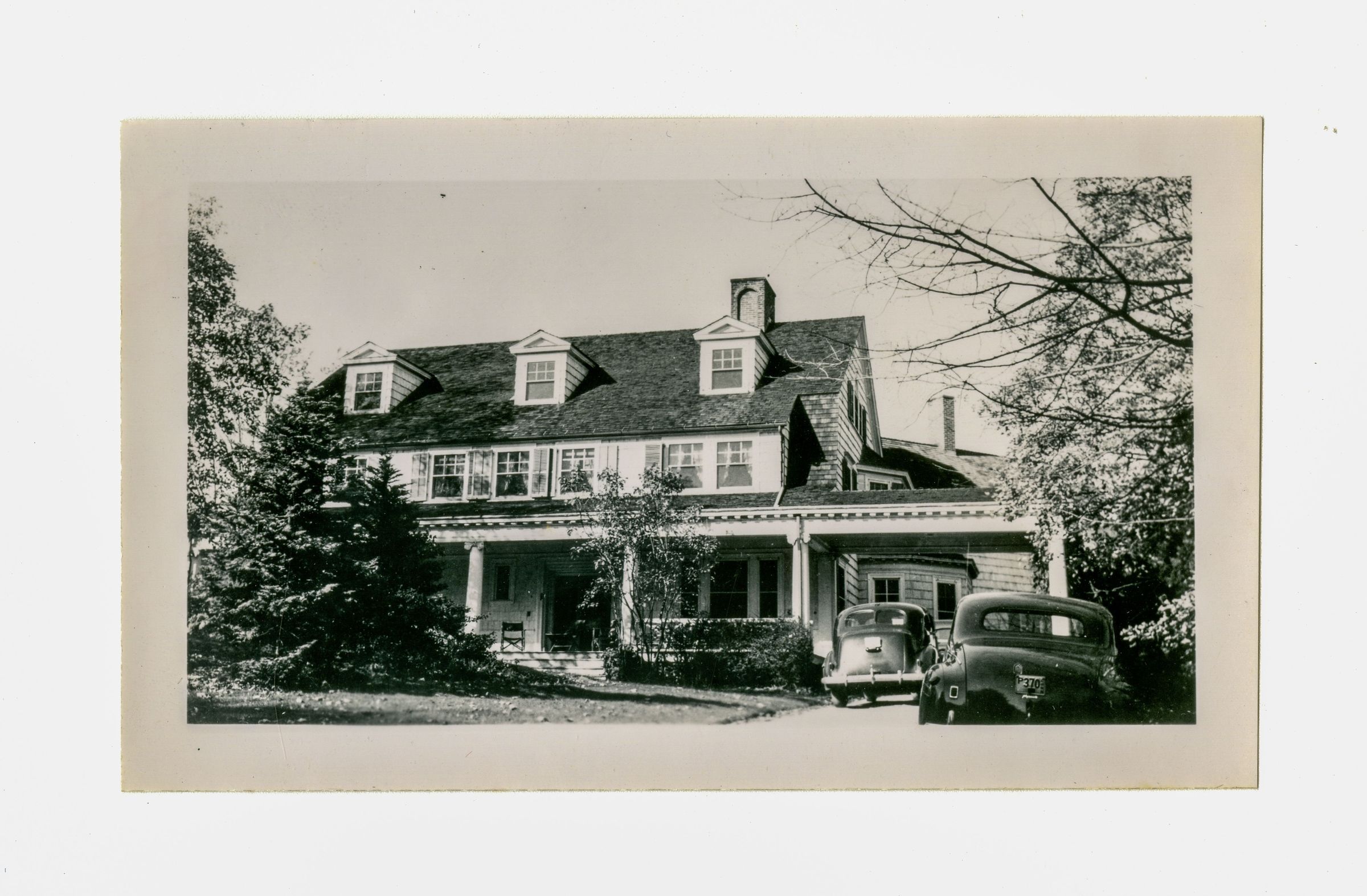 A three story shingle house with three dormers and two cars parked in the driveway.Collection